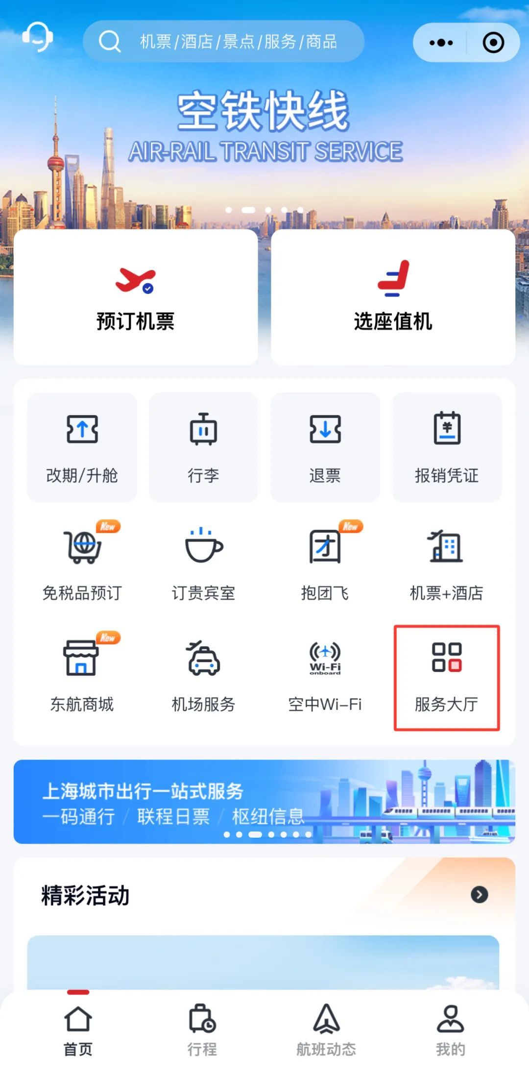 无纸化登机服务,旅客不用再排队打印纸质登机牌,通过“中国东方航空”小程序-“服务大厅”,旅客可以在网上实现自助值机,退票改期、行李服务、升舱及信息查询等31项便捷服务,通过电子登机牌即可安检、登机,享受更加便捷高效的出行体验。