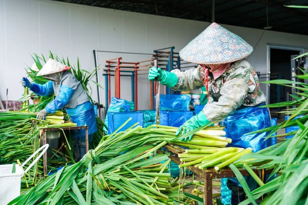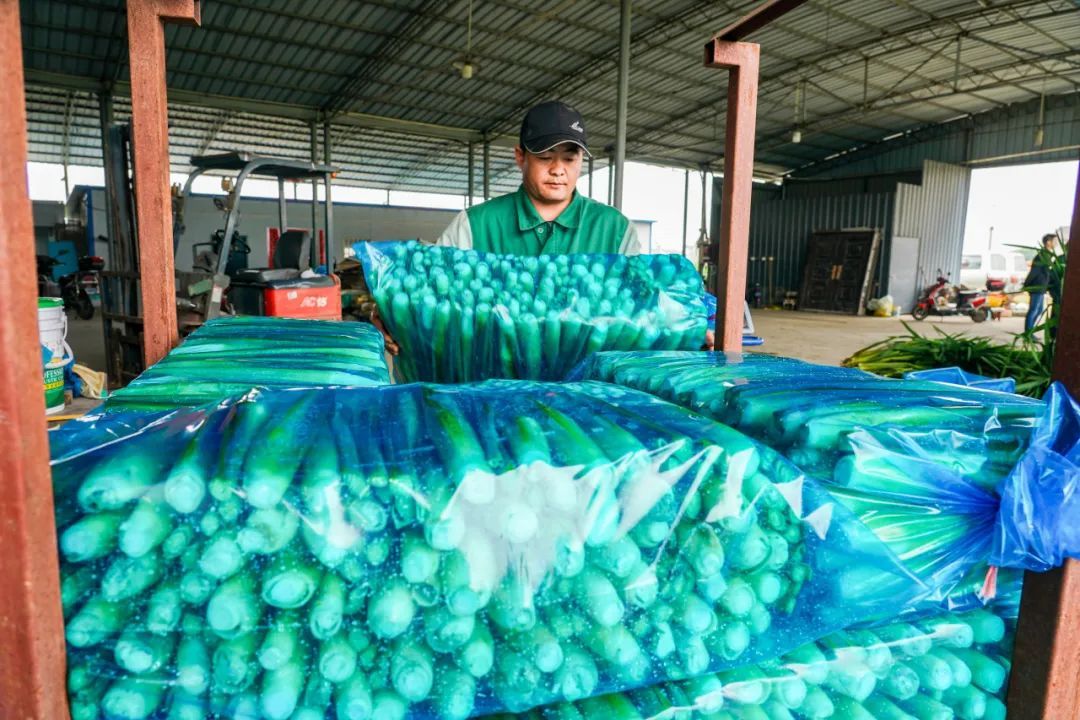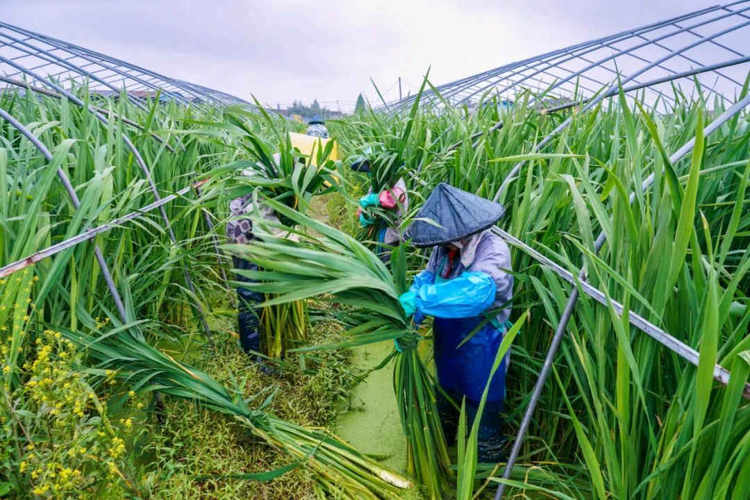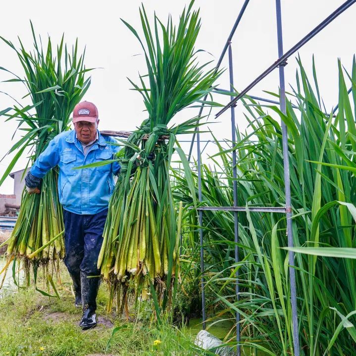 身着渔裤的茭农们穿梭在大棚茭白间,弯腰、挑选、拔起,一气呵成,没一会儿茭农手中已塞满一大捆,随即熟练地用茭叶把茭白捆拢。上岸后的茭白还挂着泥水,剪掉长叶、剥掉老壳后,白胖胖的茭白就露出来了。等待了一个冬天,就为了这一口鲜甜!