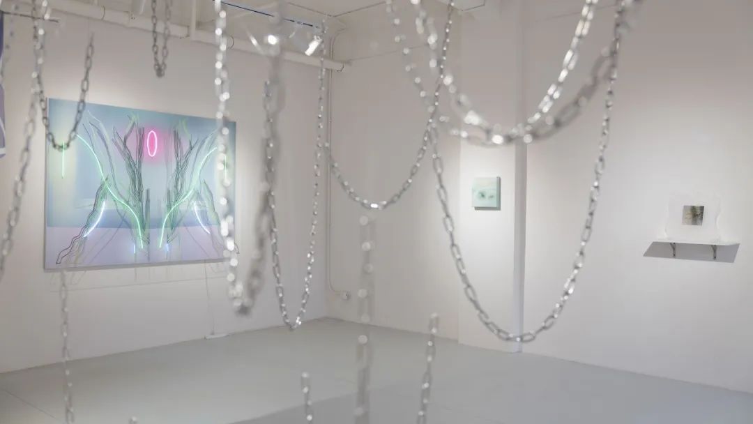 黄喆君是一名于改革开放时期在上海成长起来的90后。混合的工业材料和城市灯光塑造了她的视觉经验。她的作品常用反光表面、硬边、荧光炸眼,结合工业材料和传统绘画技术捕捉当代自然和非自然的景观。预设的西方形式语言以流动的媒材绘制,留下了其自然且有机的形态,同时展现了其怪异的人工感——就如中国古代墨水也成为了后工业世界的产物。