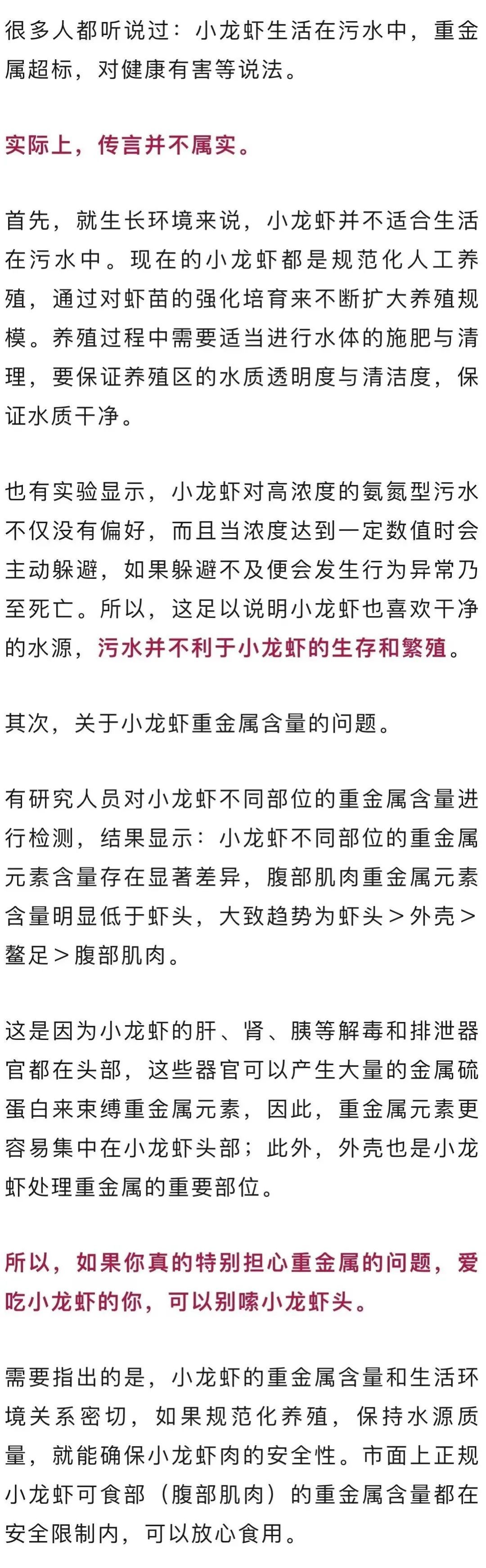 近日,小龙虾降价相关信息多次登上网络热搜。不少小龙虾爱好者在评论区直呼“高兴了”“这样我每天吃两顿小龙虾”……然而也有一些网友表示担忧,因为他们曾听说:“小龙虾生长在臭水沟,喜欢污水,重金属超标,不能吃”。
