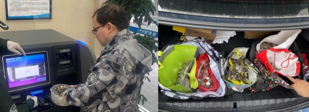 近日,袁女士至北外滩支行兑换多年积攒的老钱币,最早为1955年版5分钱,部分已发霉生锈。支行了解情况后表示可以当场兑换,随后三名工作人员轮番上阵,在不耽误其他客户办理业务的情况下,经过两个多小时的接力,将数千枚面额为1分、2分、5分的硬币分类、去污、清点完毕。