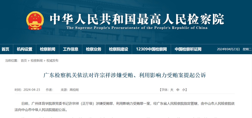 据最高人民检察院网站4月23日消息,日前,广州体育学院原党委书记许宗祥(正厅级)涉嫌受贿罪、利用影响力受贿罪一案,经广东省人民检察院指定管辖,由中山市人民检察院依法向中山市中级人民法院提起公诉。