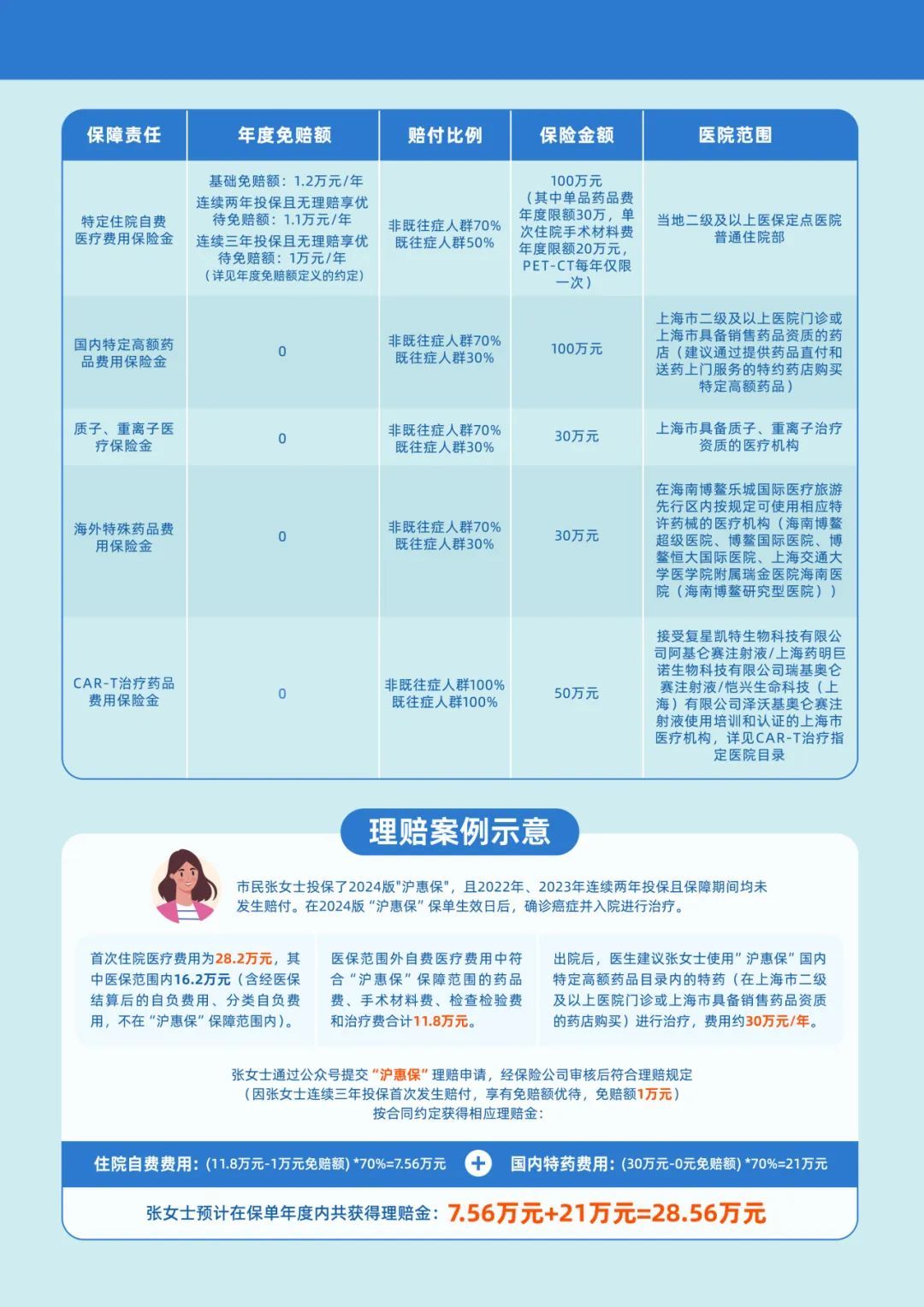 沪惠保2024版 产品介绍及理赔案例 2024沪惠保再度升级! 2024年“沪惠保” 服务升级 2024增值服务 NO.1 全市专属药店购药9折 知名连锁药房药品结算价10%抵扣的沪惠保专属权益,年度抵扣额度10000元,全年无限次使用 1.线下实体药房购药,抵扣比例10%,覆盖上海16市辖区2000+门店 使用期限:4月23日起 2.益丰大药房线上O2O购药,抵扣比例10% 使用期限:6月1日起 NO.2 图文问诊优惠 1.7*24小时三甲专科医生快速问诊 2.满足大部分日常轻症医疗、夜间服务需求(使用期限:6月1日起) 服务内容: 三甲专科医生快速问诊服务,客户咨询经分诊后,由对应的三甲专科医生提供图文问诊服务 服务形式及时效: 7*24小时在线 一般3分钟内接诊,不超过10分钟 沪惠保专属优惠价(9.9元),每人限一次 奉贤理赔案例 奉贤的Y女士,74周岁,帕金森病 非既往症身份参保,入院治疗共花费27.6万,其中自费20.1万元。通过“沪惠保”申请理赔,经审核后获赔12.7万。 奉贤的Z先生,73周岁,肝癌 非既往症身份参保,罹患肝癌,于上海交通大学医学院附属第九人民医院治疗,累计自费29.37万元,通过“沪惠保”理赔,经核定,共获赔21.95万。 奉贤的W女士,16周岁,脊柱侧弯 非既往症身份参保,确诊脊柱侧弯,于2023年8月出院后,通过“沪惠保”申请理赔,入院治疗共花费12万,其中自费5.2万元,经审核后获赔2.7万。 奉贤的L小朋友,5周岁 罹患胶质母细胞瘤 于2022年10月确诊胶质母细胞瘤,门诊特药共花费119万,已通过“沪惠保”理赔5次,每次16.68万元,累计赔付83.4万,有效缓解医疗费用负担。 奉贤户籍“四类特殊困难群体”无需自行投保 由政府统一办理投保 政府100%予以补贴