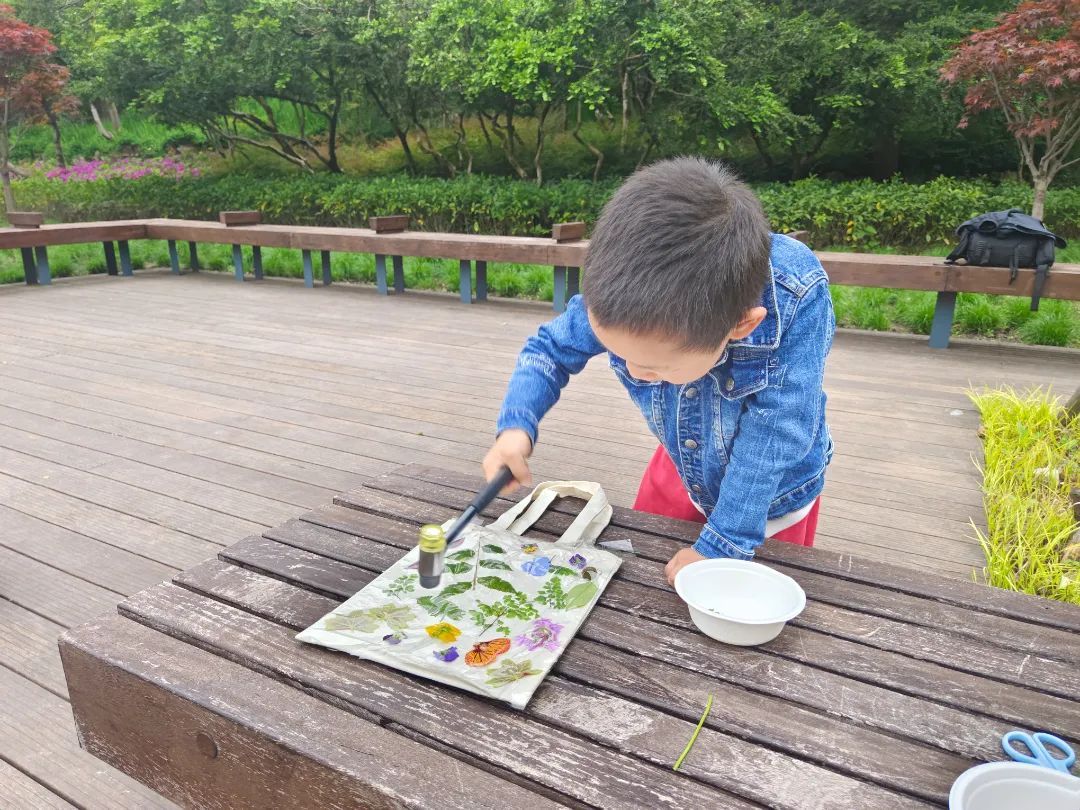 在陶立旻的讲解中,孩子们认识了公园中的不少植物。为了让大家更加亲近自然,来自艺术机构的老师们还准备了拓印活动,让大家制作属于自己的低碳作品。