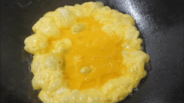先将打好的鸡蛋液煎至金黄色备用