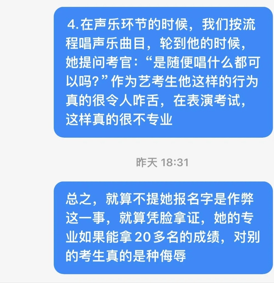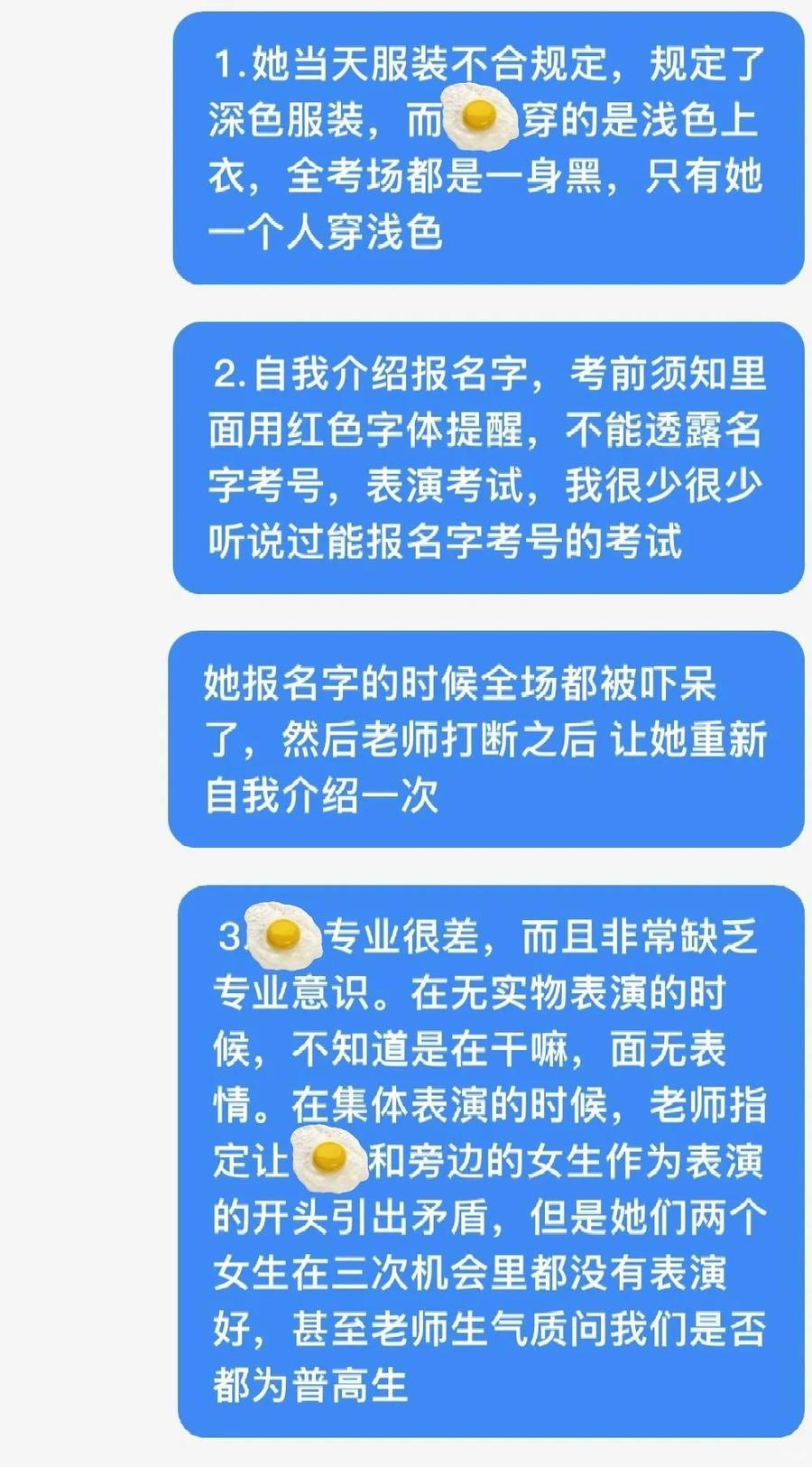 有知情网友爆料称,据北京电影学院考试要求,考生要穿深色形体服,且不能以任何形式透露姓名。但同考场考生透露,李某某考试当天穿了浅色形体服,并自曝姓名。