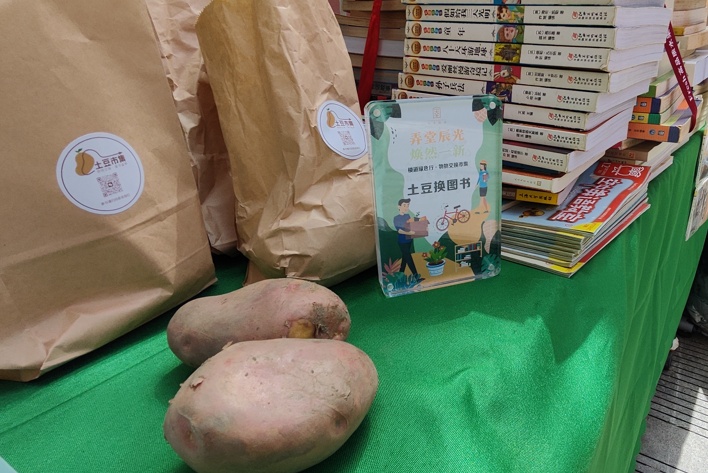 与此同时,两位热心的妈妈推着满载图书的平板车步入市集,车上堆叠着琳琅满目的绘本与小人书,其中不乏崭新的《三国演义》画册和《西游记》典藏版。她们得知书籍可捐赠给偏远地区的孩子们,特意精心挑选、打包而来。工作人员告知,这些书籍将直抵爱心图书馆前往云南。作为回馈,她们收到了来自云南高原的孩子们亲手种植的红皮土豆。两位妈妈满心欢喜,期待回家与自家孩子分享这份特别的“知识换粮食”的故事,仿佛瞬间拉近了城乡孩子们心灵的距离,上演了一出现代版的“投桃报李”。