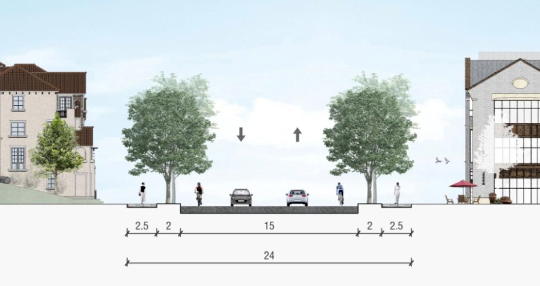2.5m(人行道)+2.0m(绿化带)+15.0m(车行道)+2.0m(绿化带)+2.5m(人行道)=24m(红线宽度)。
