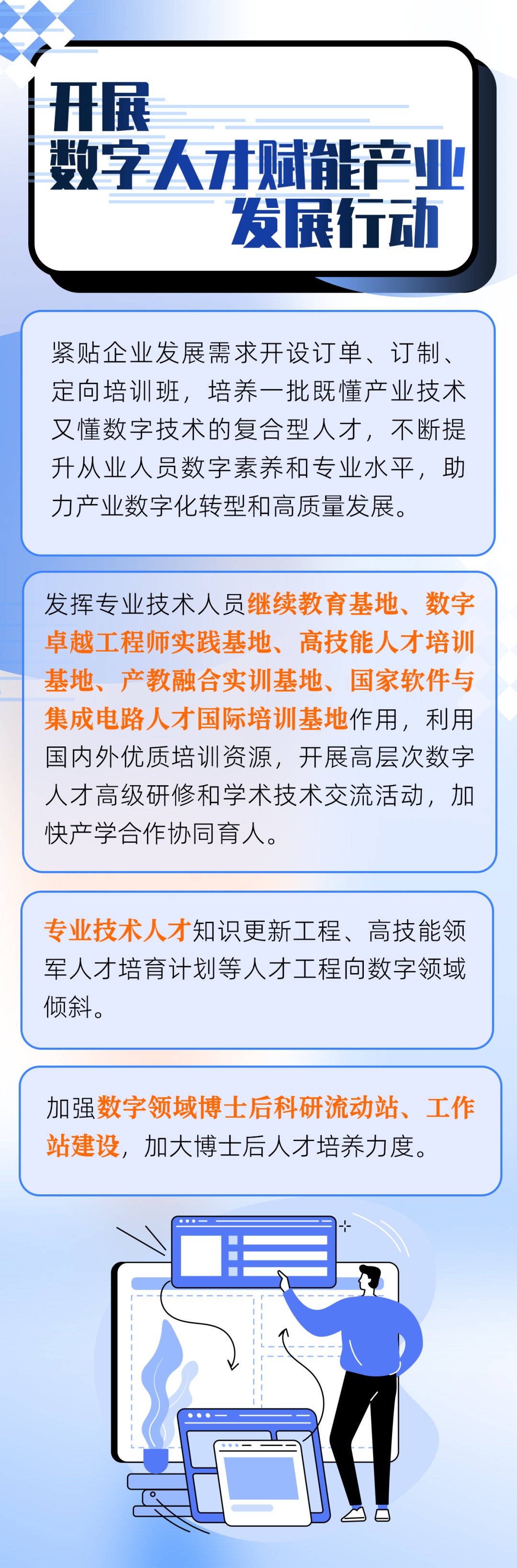 近日,人力资源社会保障部、中共中央组织部、中央网信办、国家发展改革委、教育部、科技部、工业和信息化部、财政部、国家数据局等九部门印发《加快数字人才培育支撑数字经济发展行动方案(2024-2026年)》,紧贴数字产业化和产业数字化发展需要,用3年左右时间,扎实开展数字人才育、引、留、用等专项行动,增加数字人才有效供给,形成数字人才集聚效应。