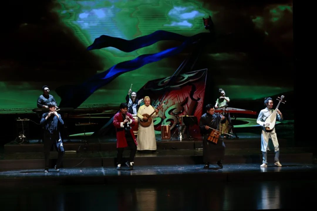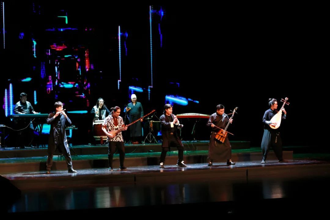 整场演出新潮、酷炫,多媒体大屏和灯光配合不同曲目呈现出动漫效果与古雅意蕴交织辉映的效果。满头银发、一袭白衫的方锦龙展现出极强的控场能力和幽默天赋,像“老顽童”一样带领弟子们和“大威天龙”乐队与观众频繁互动。从曲目安排来说,题材丰富、风格多样,在传统基础上创新编配:既有摇滚作品《国乐新摇滚》,又有展现古典诗词唯美意境的《诗经·小雅·鹿鸣》《诗经·商颂·玄鸟》《破阵子·为陈同甫赋壮词以寄之》,也有少数民族风味的《卡尔纳瓦》《白马》《嘎达梅林》,还有红色曲目《映山红》,更有传统经典曲目《梅花三弄》《春江花月夜》,甚至还有脱口秀《国乐无双》。从乐器组合来说,除了国乐演出常见的笛、箫、唢呐、阮、古筝、古琴、马头琴、弹布尔等,以及方锦龙的标志性乐器“五弦琵琶”,还有键盘、贝斯等电子音乐。在脱口秀环节,方锦龙巧妙介绍了历史悠久的骨龠、簧、鼻箫、巴乌、尺八等民族乐器,把对传统文化和民乐的深沉热爱通过风趣诙谐的讲述与信手拈来的现场演奏体现出来。他用传统乐器娴熟模拟电音与西洋乐器,惟妙惟肖,赢得阵阵欢呼与掌声。返场曲目《葫芦娃》以及《沧海一声笑》更是嗨翻全场,不同年龄段的观众都能产生共情与共鸣。曲风的变幻,节奏的跳跃,国乐、人声、电音的对话使得本场演出区别于传统的民乐演奏,紧扣“青春”与“国潮”主题。