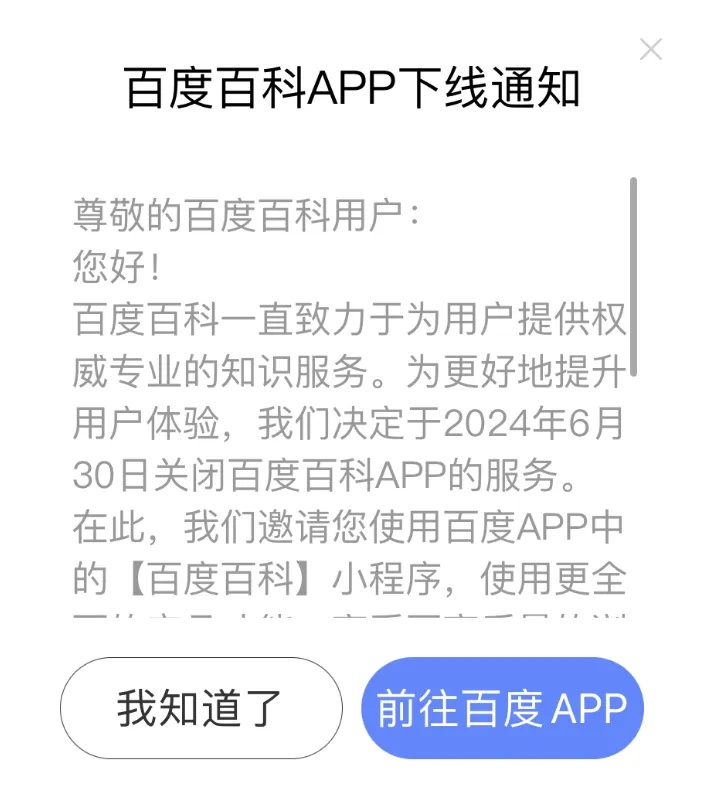 百度百科App下线通知 尊敬的百度百科用户: 您好! 百度百科一直致力于为用户提供权威专业的知识服务。为更好地提升用户体验,我们决定于2024年6月30日关闭百度百科App的服务。在此,我们邀请您使用百度App中的【百度百科】小程序,使用更全面的产品功能,享受更高质量的浏览体验。 敬请广大用户周知,并对给您带来的不便表示歉意。如您有任何疑问,请联系我们的客服。我们将一如既往地为您提供优质的知识服务。期待在新的产品中再次为您服务! 百度百科团队 2024年4月22日