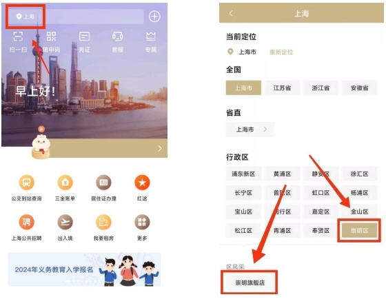 方式二:用户可实名登录“随申办”市民云App后,精准定位点击进入崇明旗舰店首页。