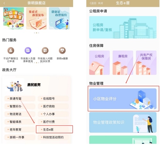 为进一步规范本区住宅物业服务活动,提高住宅物业服务水平和住户满意度,崇明区住房保障房屋管理局会同崇明区数据局在“随申办”市民云崇明旗舰店上线“小区物业评分”服务。 操作步骤 各位市民可进入崇明旗舰店后,在“生态e居”服务中找到“小区物业评分”点击进入。 2.用户进入“小区物业评分”服务并选择乡镇、小区后,可从“综合管理”“清洁卫生”“秩序维护”“绿化日常养护”“设施设备保养维修”5个方面对本小区的物业服务以打星方式进行评价,1星为很不满意,2星为不满意,3星为基本满意,4星为满意,5星为很满意。同时也可对小区物业服务的总体情况进行评价,有其他意见建议的,可在评价页面底部手动勾选或输入。 注意:每位用户每月仅可进行1次评价,提交评价内容后,可在“排名统计查询”中查询本区各住宅小区物业服务企业的得分情况。