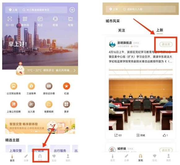 方式三:已关注崇明旗舰店的用户,可点击“随申办”首页下方“发现”频道进入“关注”栏目,找到崇明旗舰店后点击进主页。