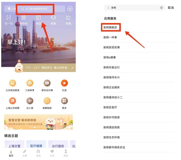 方式四:“随申办”首页搜索框中输入“崇明”,搜索“崇明旗舰店”点击进入。
