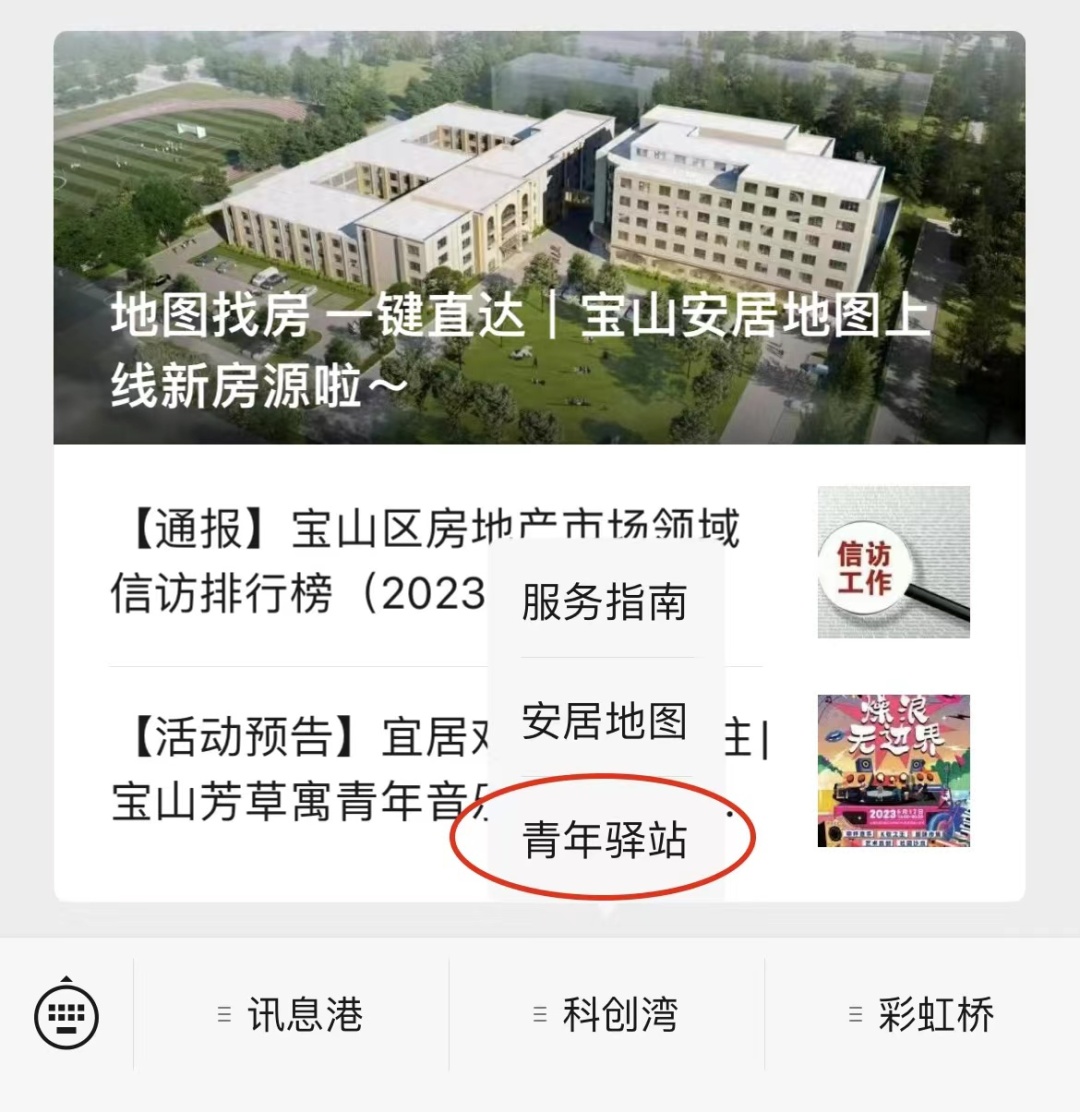 关注宝山安居微信公众号,在科创湾下拉菜单中选择青年驿站,点击打开小程序,即可畅快选择。