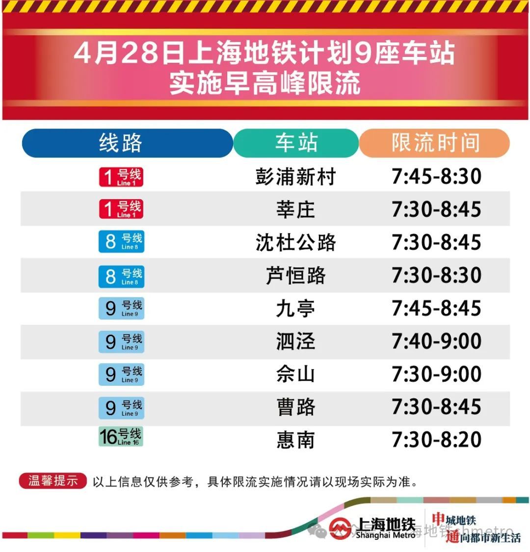 【制图】左佐【编辑】左佐4月28日,上海地铁早高峰限流措施将继续实施,届时将有9座地铁站早高峰计划限流。