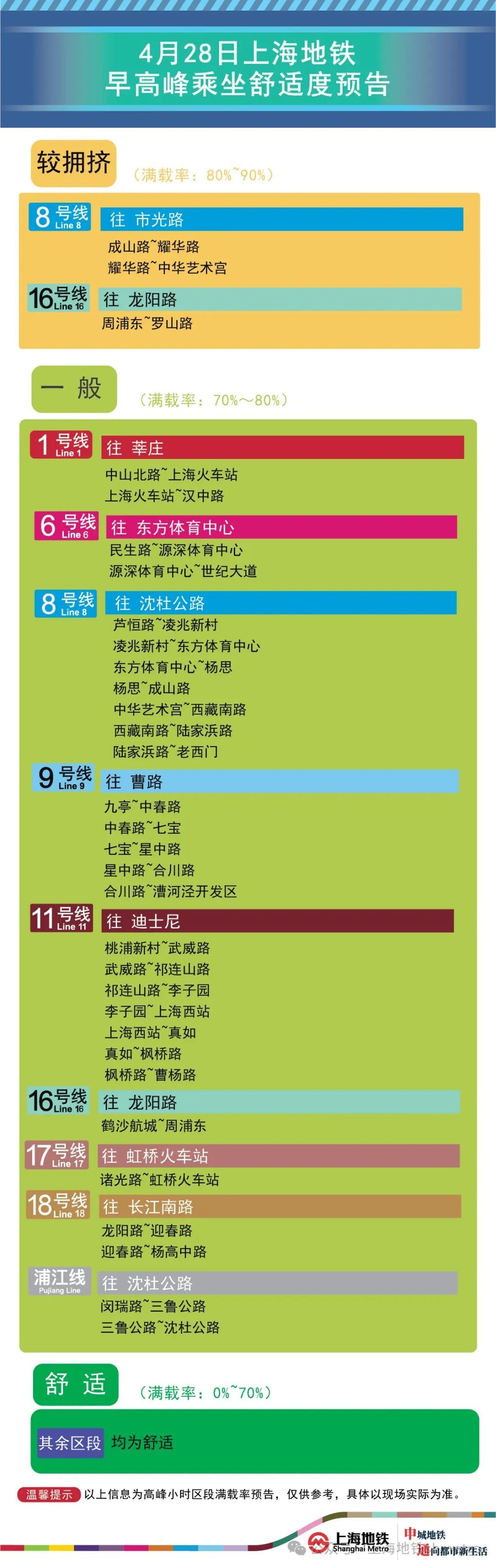 为提升上海地铁早高峰期间出行服务水平,提升乘客乘坐体验,上海地铁向乘客提供乘坐舒适度预告,方便乘客提前做好出行准备。