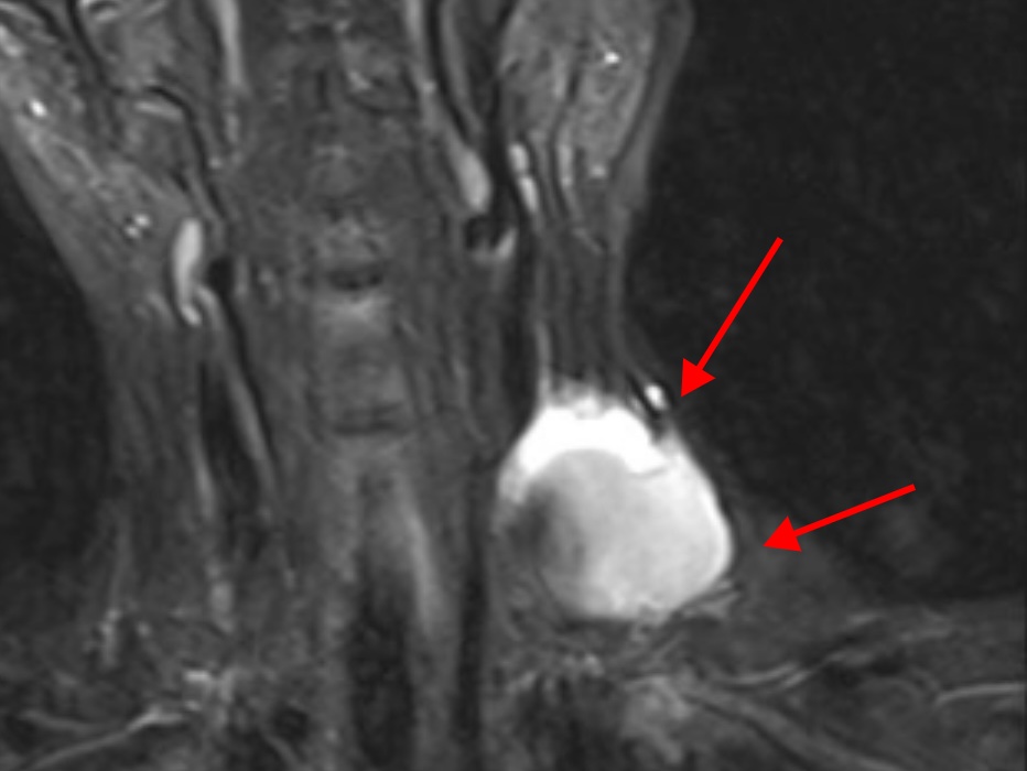 冯医生介绍道,颈部在人体结构中承担着至关重要的作用,它连接着头部和身体,支撑着头颅,同时还是呼吸、循环和消化等重要器官的通道。文女士病变的颈静脉部分,是人体头部血液回流心脏的通路,主要作用为调节血管系统容量。如果颈部受到外力打击、牵拉或扭转,可能会导致颈部动脉或静脉的破裂或撕裂,从而导致严重的出血、休克以及脑梗等并发症。