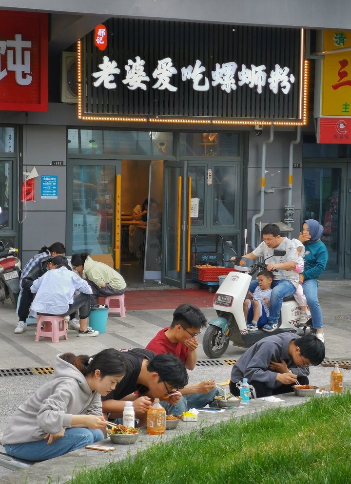 4月27日,济南市高新区舜义路。下午3点多,“老婆爱吃螺蛳粉”店外坐了许多吃螺蛳粉的年轻人。