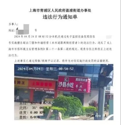 4月24日,盈浦街道综合行政执法队的执法巡查车行驶至黄泥娄路时,执法人员发现一家沿街商户存在跨门经营的违规行为。随即,执法队员迅速运用技术手段固定了现场画面作为执法依据,并通过“随申办”平台将处罚信息及时推送至当事人。当事人在收到推送信息后,迅速整改了违法行为,并在线完成了罚款缴纳。整个执法过程既高效又顺畅,是盈浦街道综合行政执法队成功完成的首例“非现”执法案件。