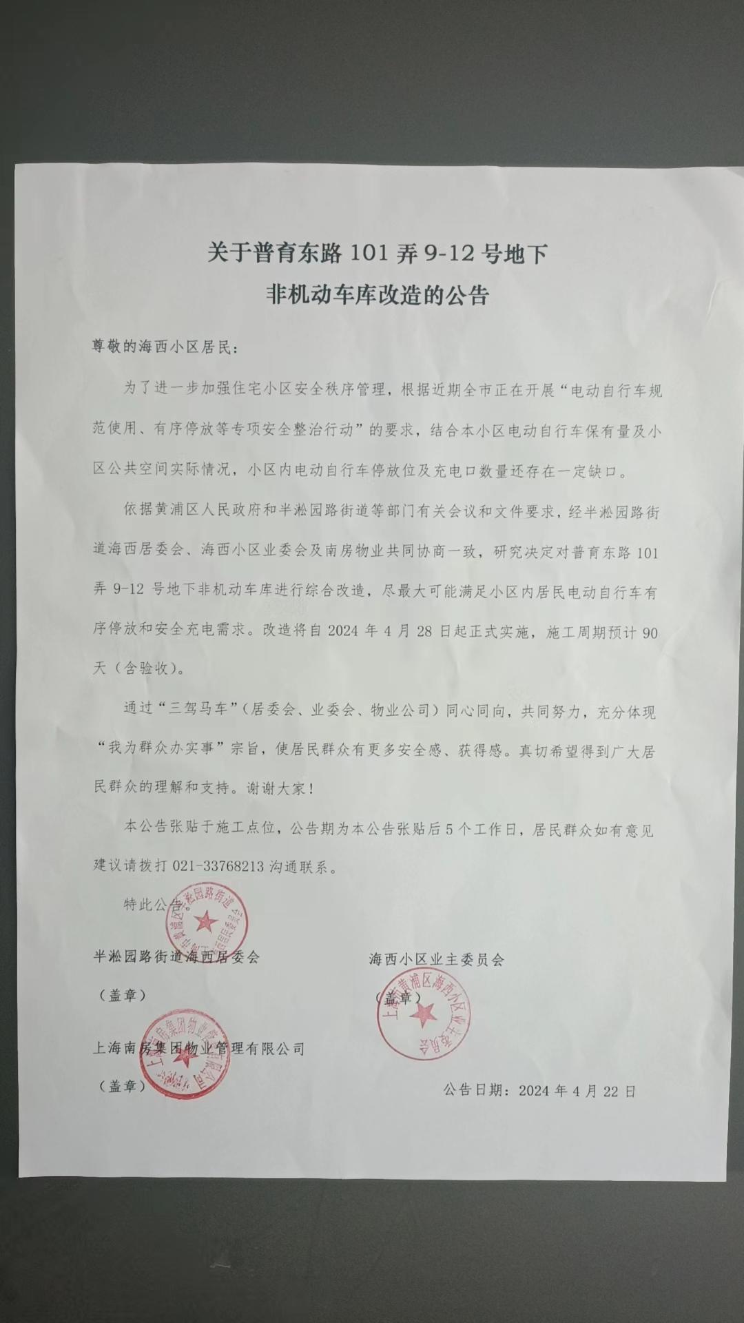 4月24日上午,普育东路101弄9—12号地下非机动车库改造工作推进会成功举行。区房管局、半淞园路街道、南房集团等相关部门参会并就完善改造方案提出意见和建议。