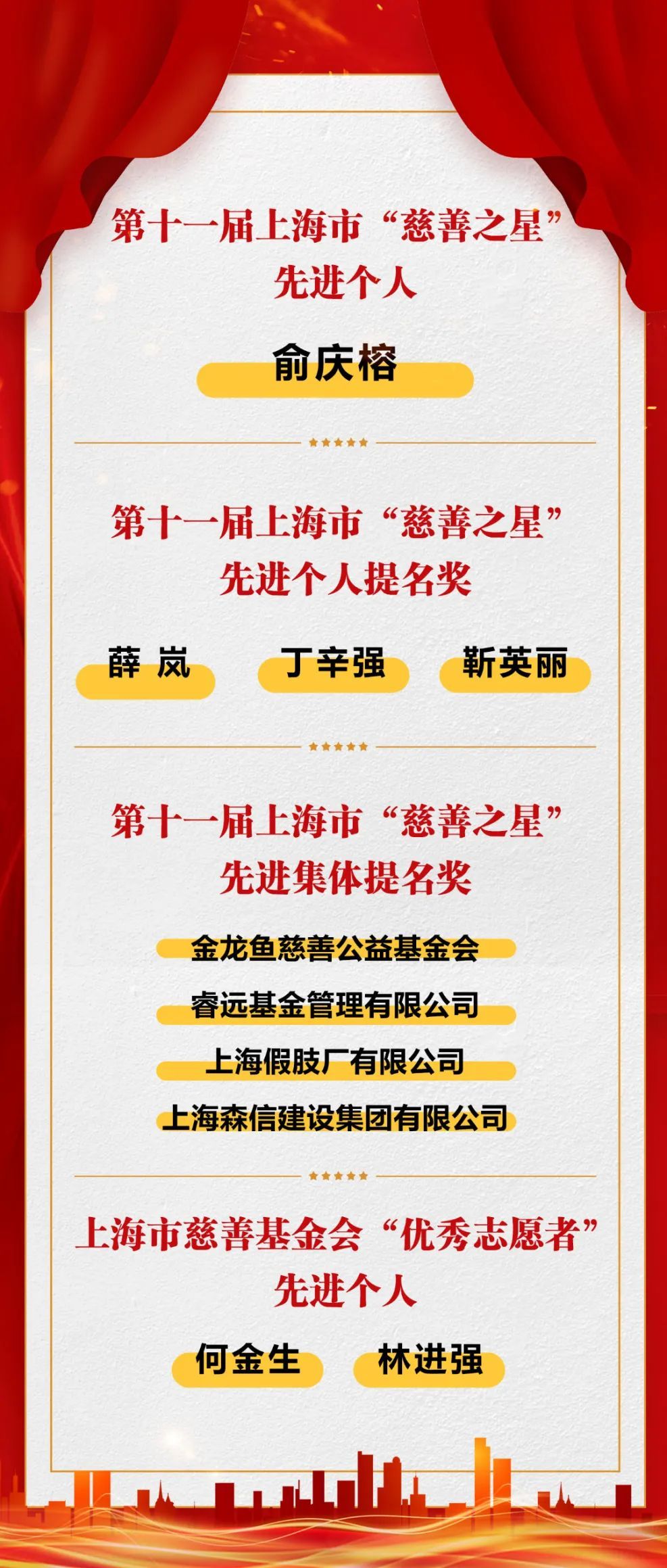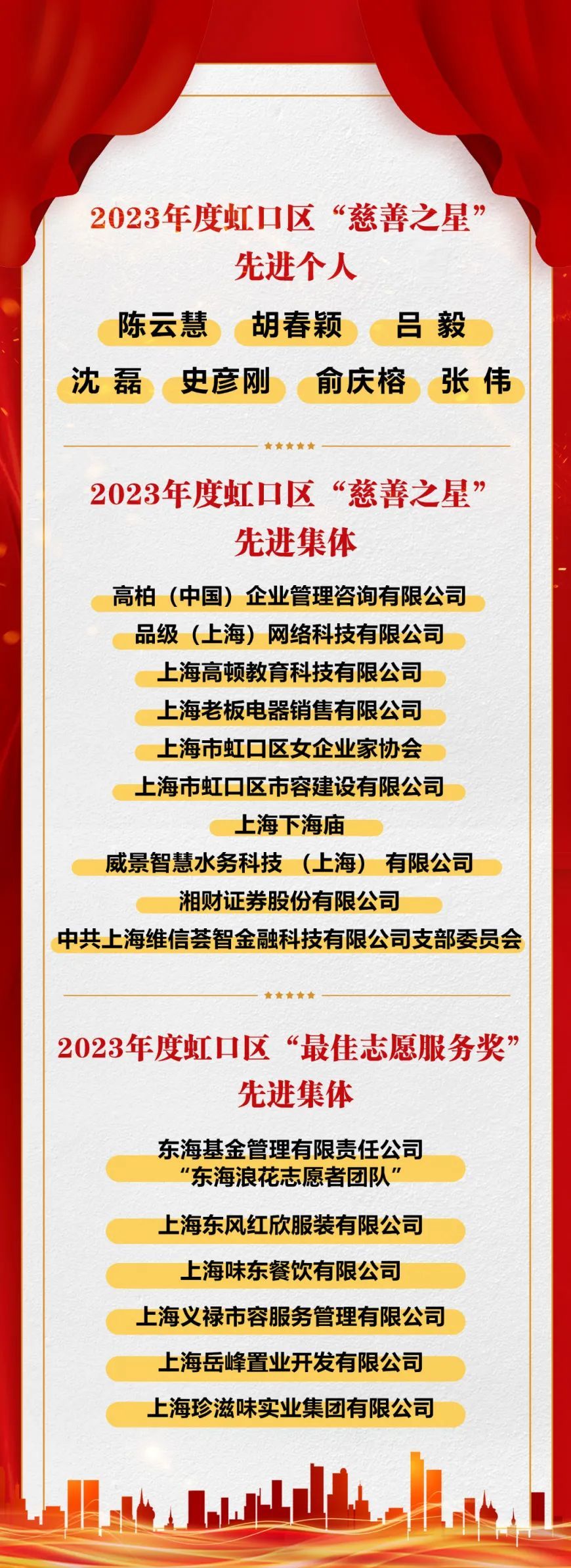 会上表彰了第十一届上海市“慈善之星”、第十一届上海市“慈善之星”提名奖、上海市慈善基金会“优秀志愿者”、2023年度虹口区“慈善之星”及2023年度虹口区“最佳志愿服务奖”先进个人和集体。