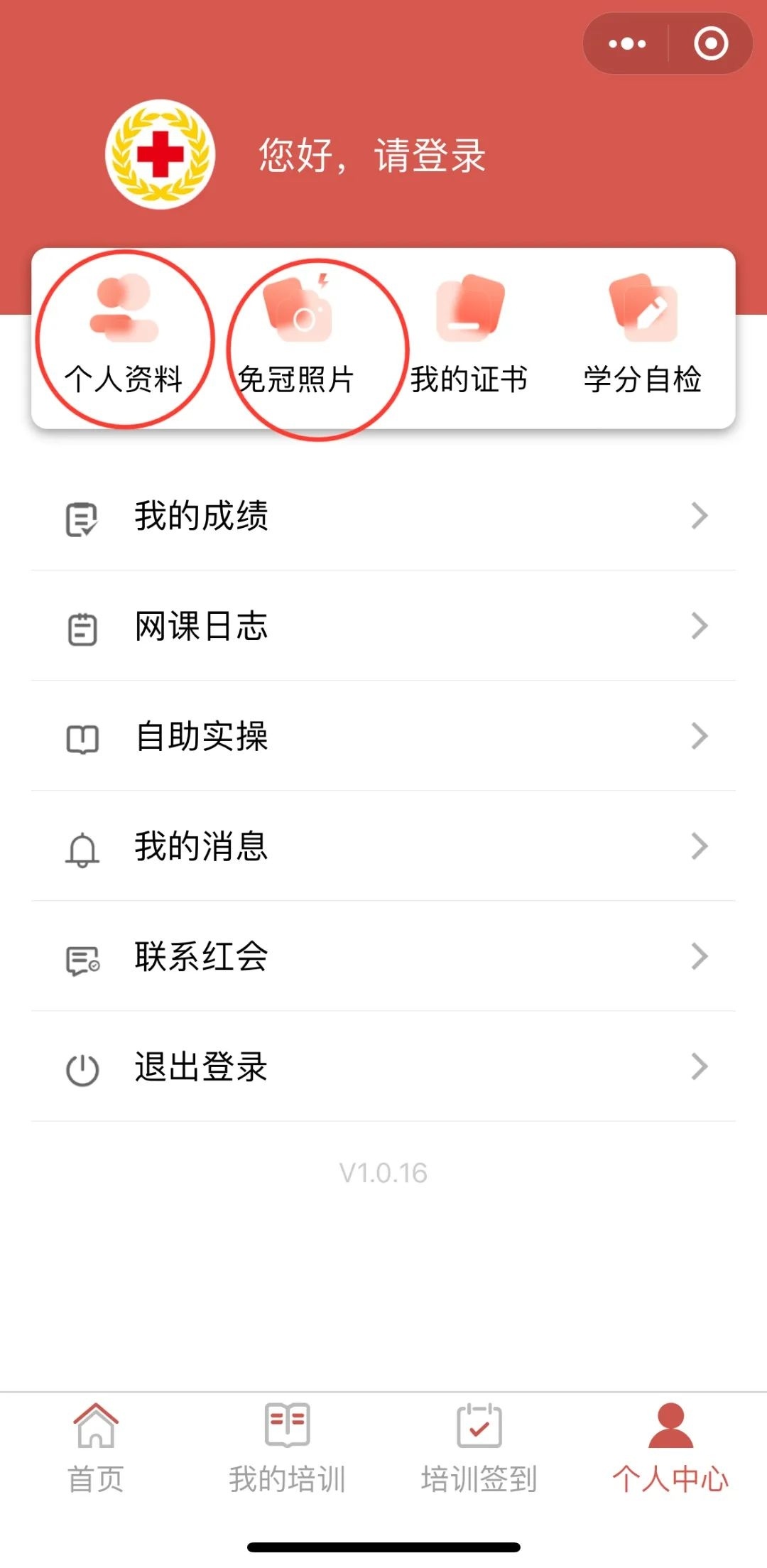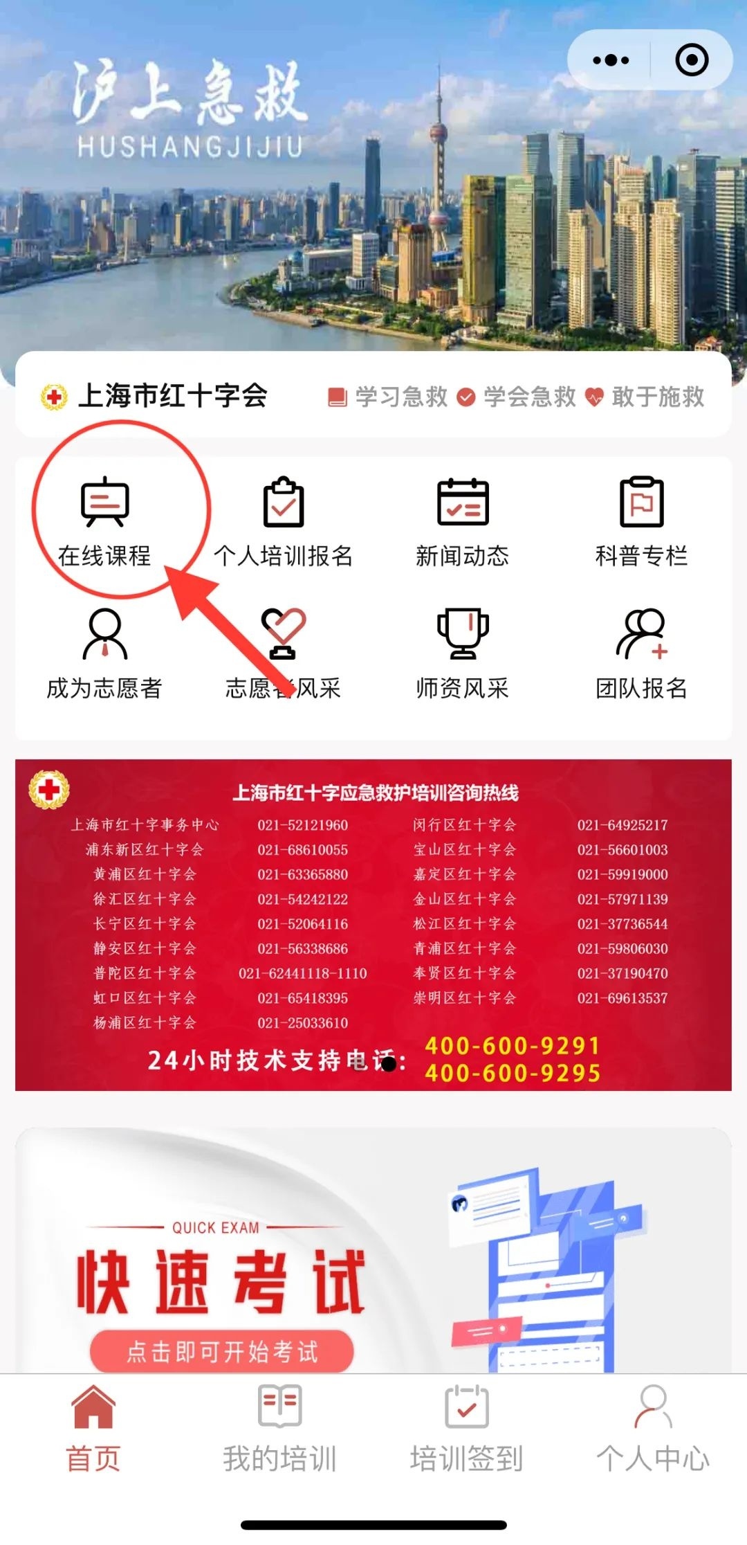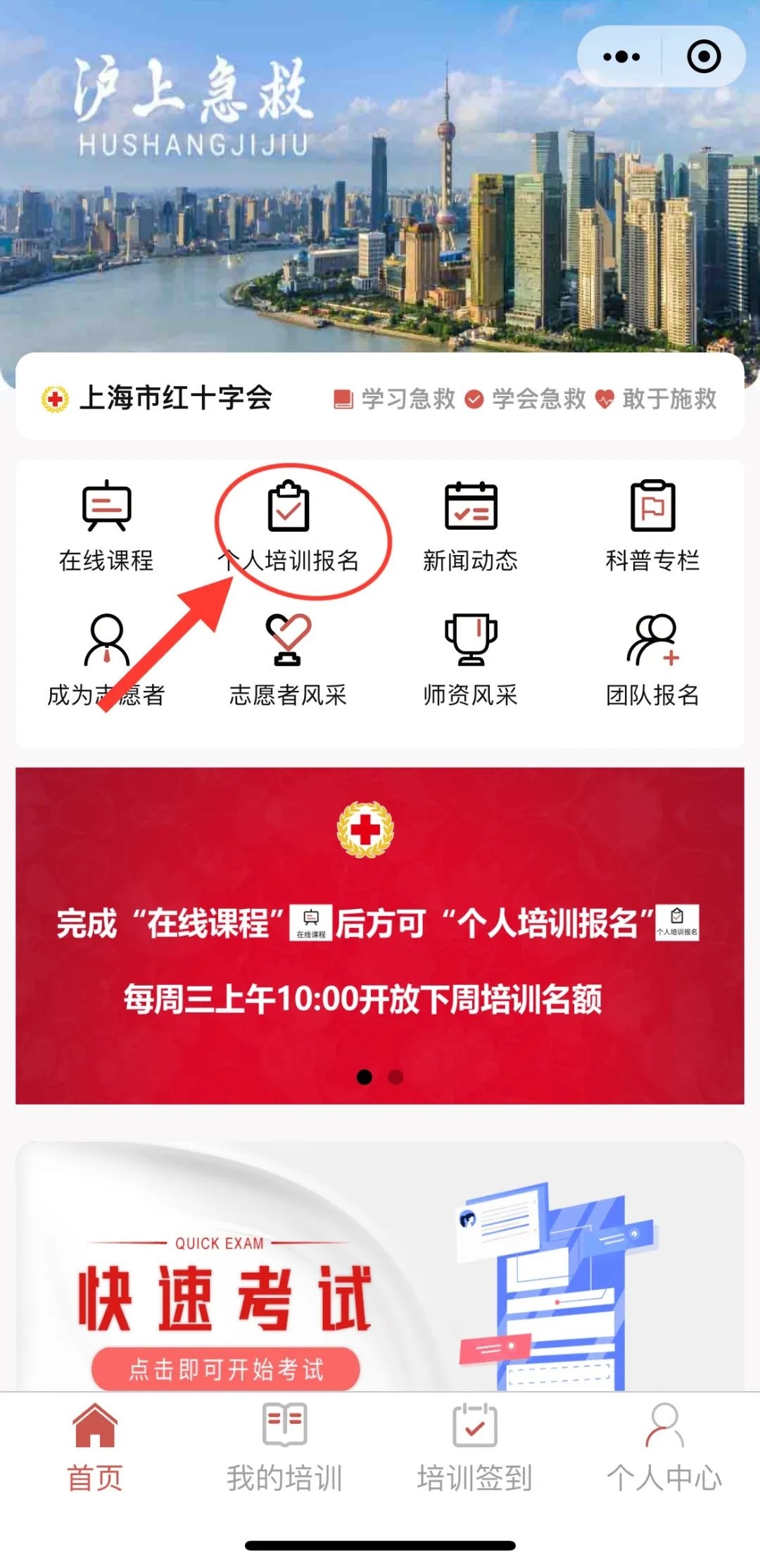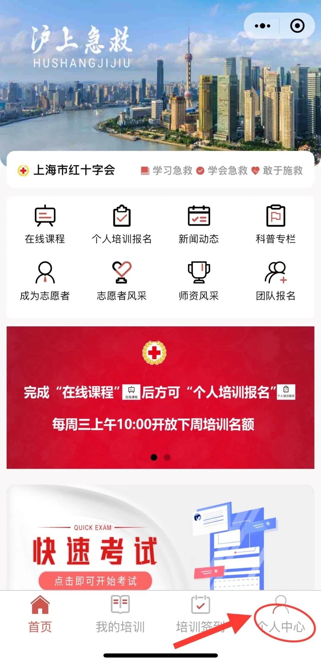 1.微信搜索“沪上急救”小程序,点击进入“个人中心”