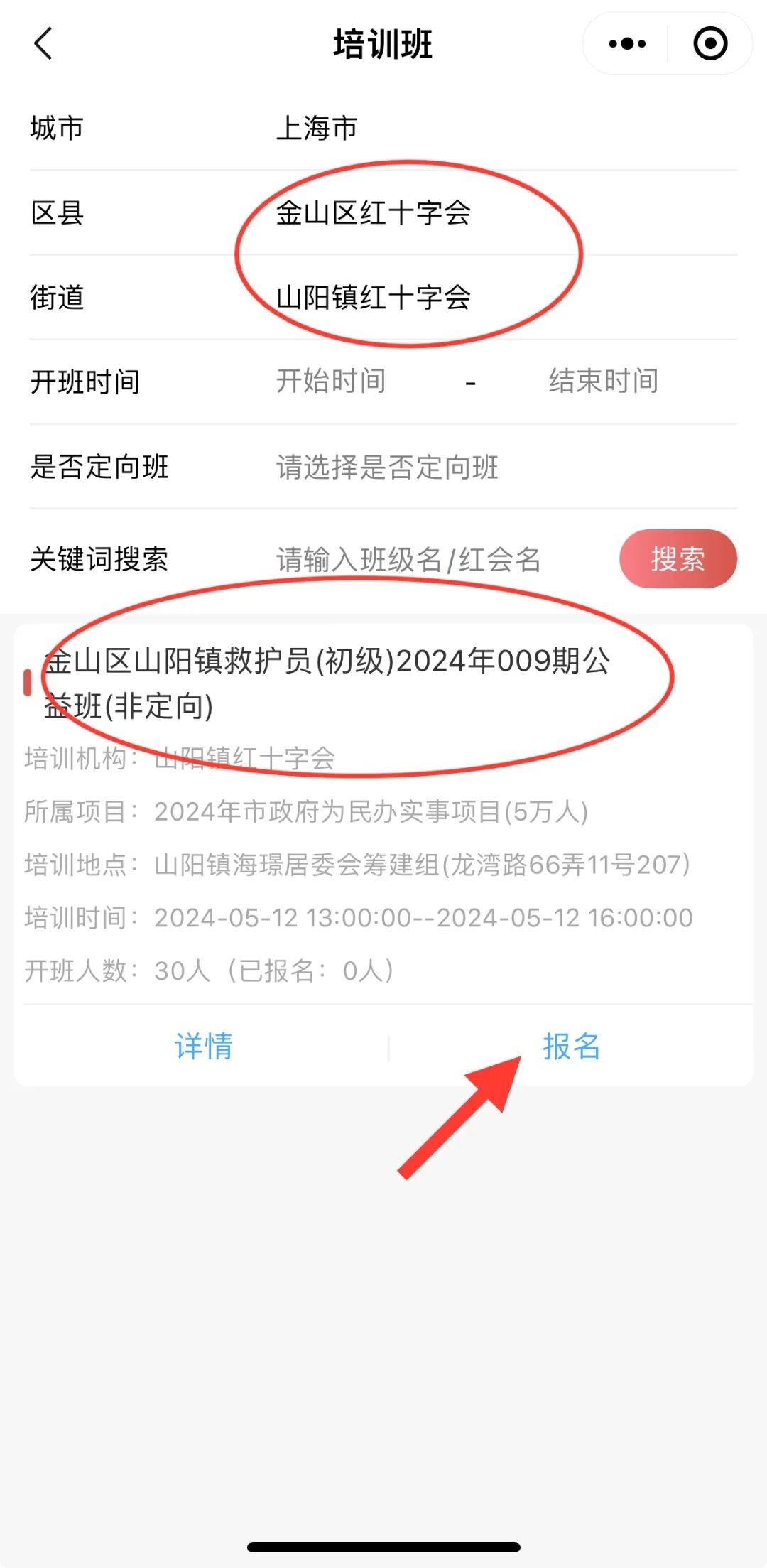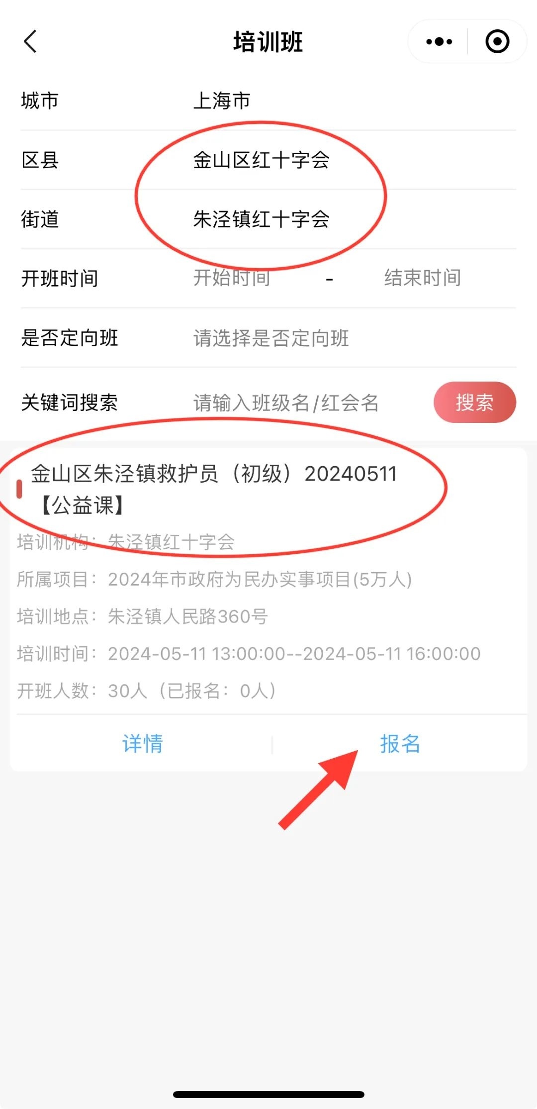 6.选择“金山区红十字会”,选择“朱泾/山阳红十字会”,选择相应班次,点击报名