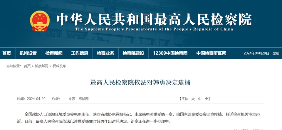 据最高人民检察院网站4月29日消息,全国政协人口资源环境委员会原副主任,陕西省政协原党组书记、主席韩勇涉嫌受贿一案,由国家监察委员会调查终结,移送检察机关审查起诉。日前,最高人民检察院依法以涉嫌受贿罪对韩勇作出逮捕决定。该案正在进一步办理中。