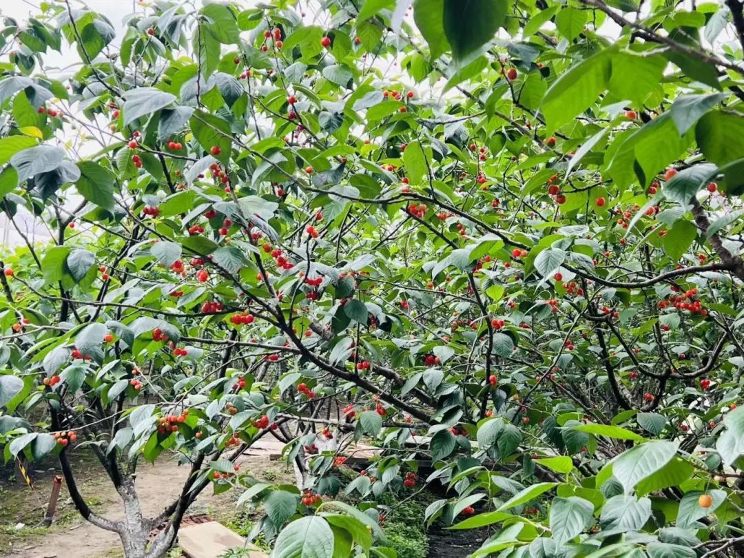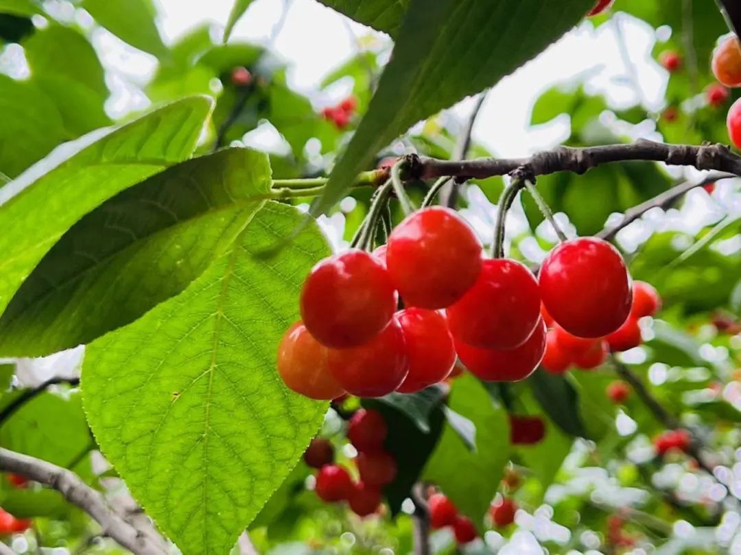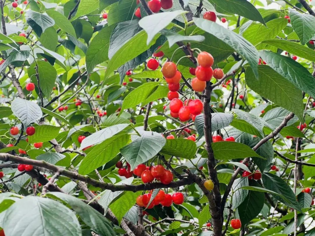 在天平村另一处桑果采摘园,樱桃也已成熟,累累果实挂满枝头。熟透了的樱桃皮薄肉厚,核小清甜。不过采摘期时间较短,只有一周左右时间。