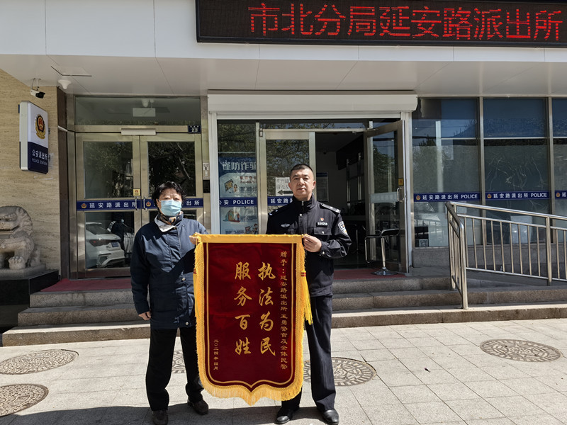 4月28日上午,群众任女士来到延安路派出所,将一面绣有“执法为民 服务百姓”的锦旗交到民警王成、辅警王勇和孙旭手中,感谢民辅警为其找回丢失的手机。