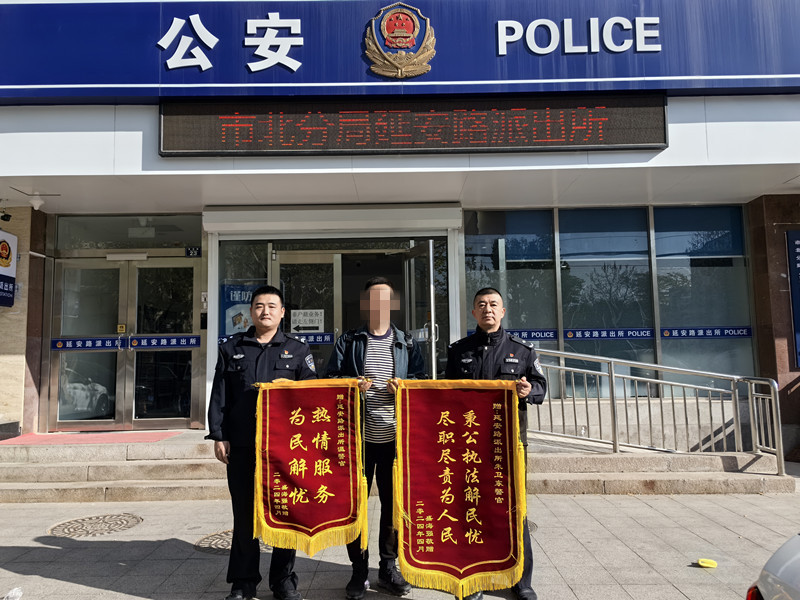 4月26日上午,群众盛先生来到延安路派出所,将两面绣有“秉公执法解民忧 尽职尽责为人民”“热情服务 为民解忧”的锦旗分别交到民警朱卫东、辅警温永存的手中,感谢民警帮助他挽回经济损失。