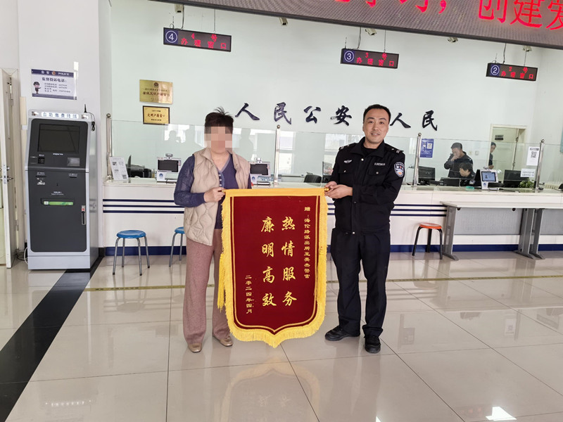 4月27日下午,市民于女士来到海伦路派出所,将一面绣有“热情服务 廉明高效”的锦旗交到辅警王英杰的手中,对其高效服务表示衷心感谢。