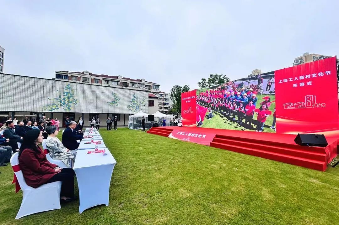早上8点半,上海工人新村文化节开幕式在228街坊的大草坪上举行。大屏幕上,“七一勋章”获得者、新中国纺织工人代表黄宝妹和长白新村街道群众代表,共同欢庆劳动节,向奋斗者致敬。现场,多名国家级、市级劳模代表上台接受致敬。