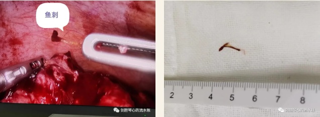 王阿婆需要进行腹腔镜下脓肿引流和异物取出术。手术中,医生发现王阿婆的大网膜、部分小肠及肠系膜都汇集于右下腹,包裹成团,充血水肿。分离黏连后,脓液像溢出的泉水一样流出来,医生小心地吸净脓液,并找到了那根致病的鱼刺。幸运的是,肠壁是完整的,没有发现裂口,说明鱼刺穿出肠壁后,肠壁穿孔已经闭合,不需要再做肠切除了。