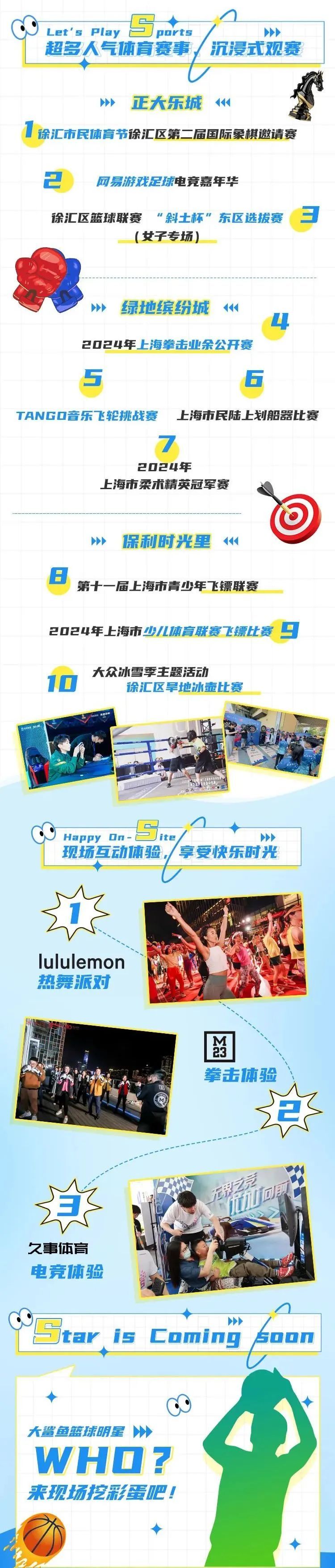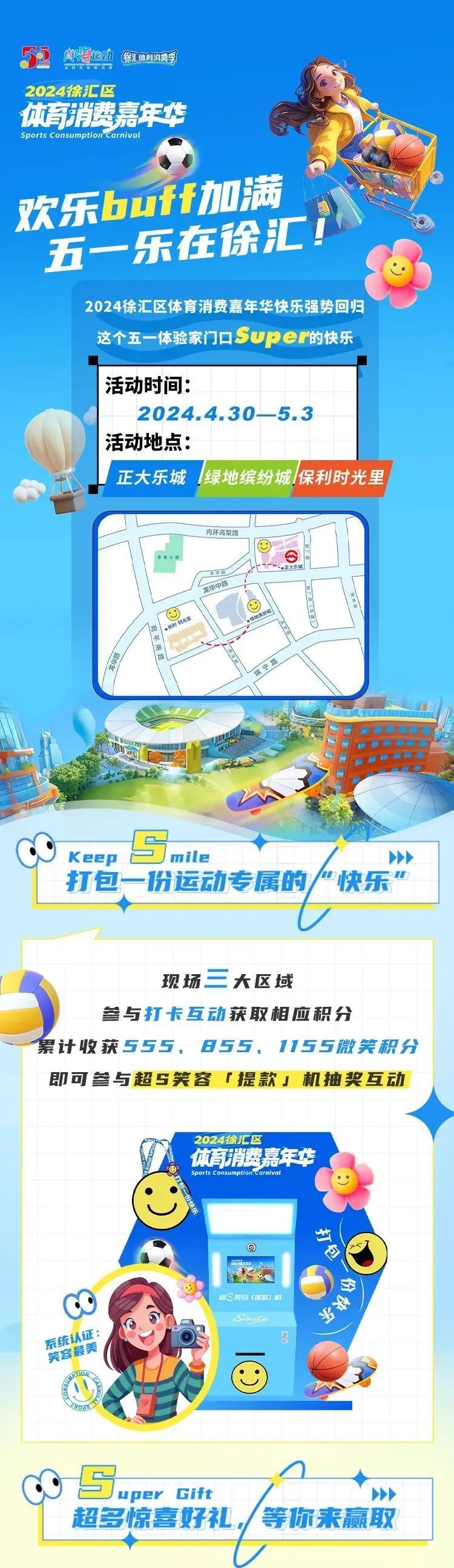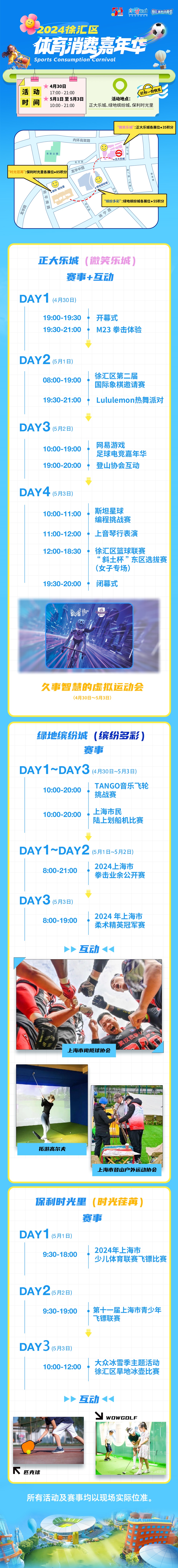 今年的徐汇区体育消费嘉年华以“打包一份快乐”为主题,涵盖群众赛事、体育集市、运动体验、文体展演等丰富内容,联动正大乐城、绿地缤纷城、保利时光里三个徐汇区的地标商圈。