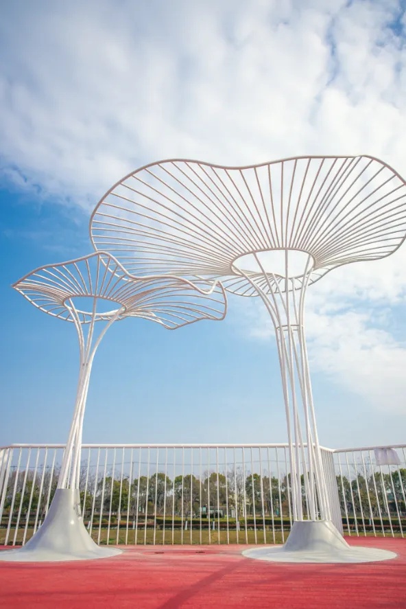 跑步途中,不时听见林间鸟儿在天空中鸣啭吟唱,仿佛欢迎你一同来到静谧大自然;一路上,个性鲜明的花卉景观与乔木群落共同绘就错落有致的滨水生态圈,实现季季有风景,月月可观花;微风阵起,岸边“梦享乐章”的主题艺术雕塑随之风铃声声,与琴键形式的地面铺装交相辉映,把游客带进一场音乐新旅……对了,梦享跑道共有12处景观节点,以一天十二时辰为序,体验芬芳、冥想、绽放、集市、星秀、童趣、乐章、飞扬驿、探索、鱼悦、鸣啭、中心驿等独特景观。