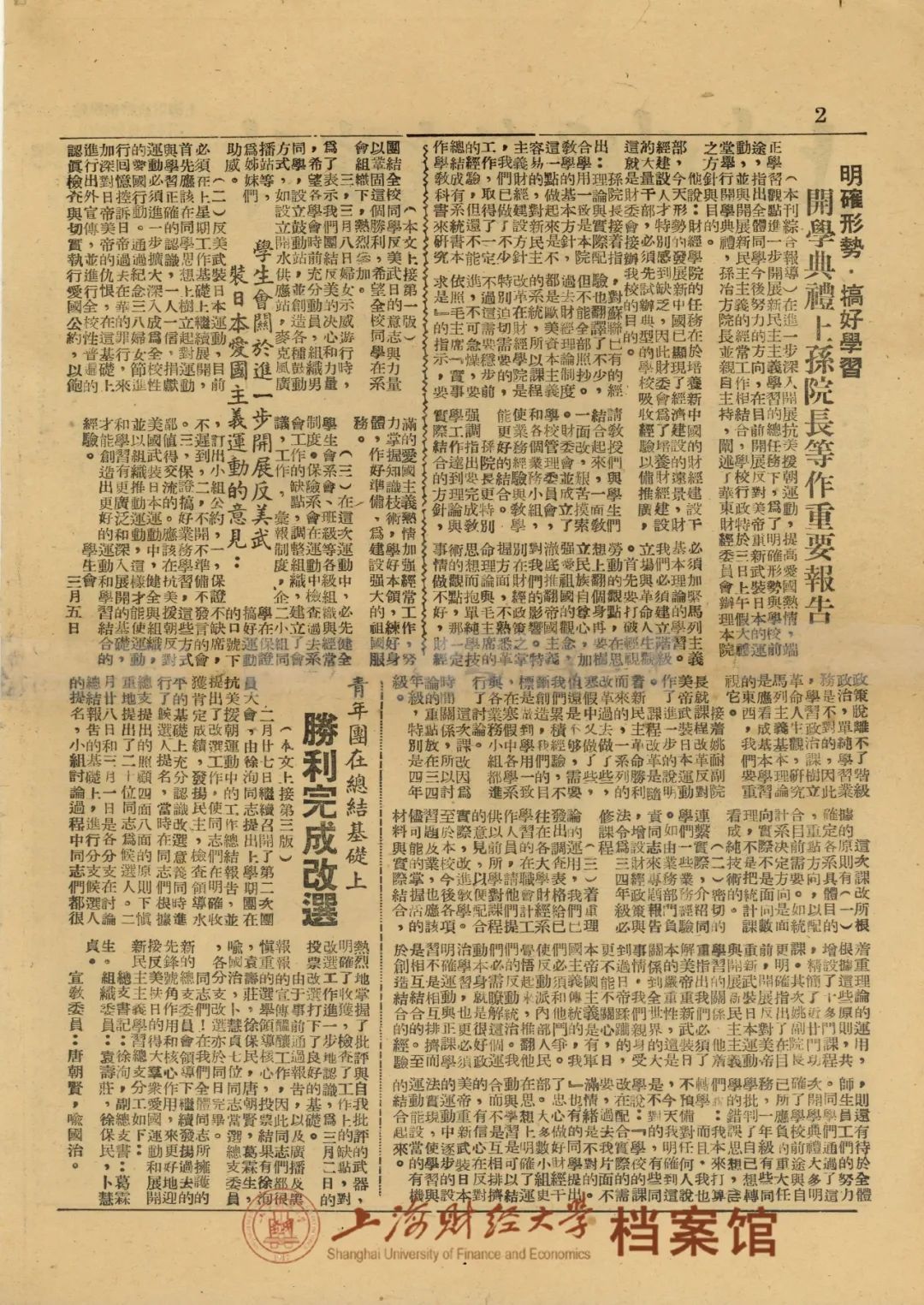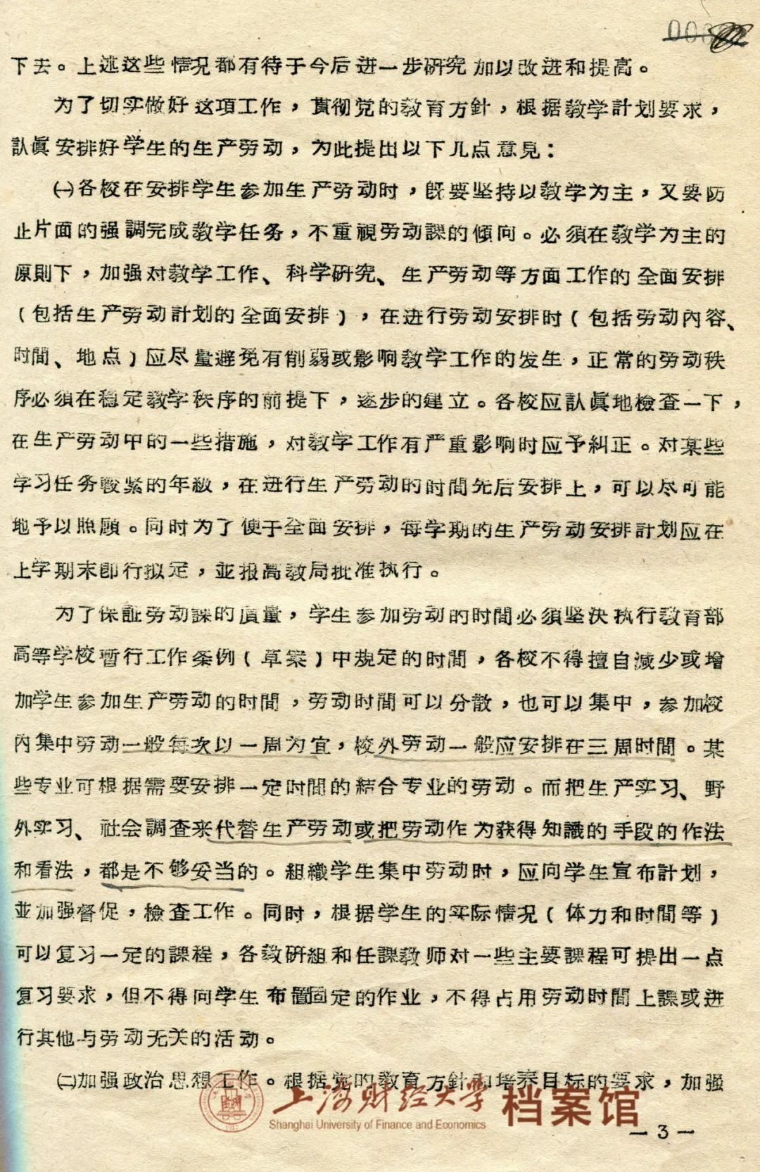 在1958年的校报《党委会召开全院师生员工大会报告整改工作》中姚耐院长向全院师生提出今后六项任务,其中之一即是“勤俭办学,劳动教育”,他强调“学校中应树立俭朴的风气;同时学校所要培养的是劳动者,不是脱离实际,脱离群众,脱离工农的知识分子,应该首先是一个劳动人民”。1958年,学校与其他单位合并组建上海社会科学院,在并校前夕,上海财经学院学生会委员会代表全体同学,提出坚决拥护并校,并作出保证:坚决执行集中劳动和集中调查研究的决定……在暑期中积极参加工农业生产劳动。