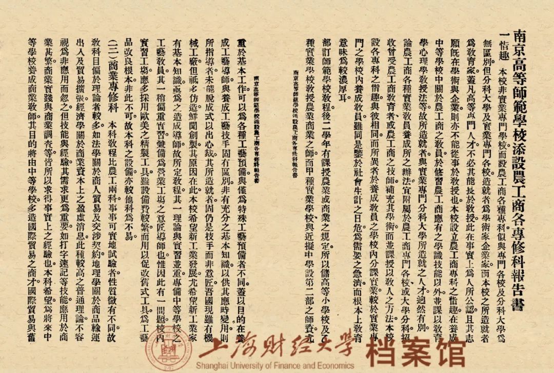 1917年,为适应民族工商业发展对商业人才的需求,南京高等师范学校增设商业专修科,此为上海财经大学的历史源头。自商科设立,便有注重联系实际、参与实习实践的传统。1918年10月,郭秉文在关于南京高等师范学校概况的报告书中曾称:“本校实习有两种:(一)为实科之实习……如工有工场实习,农有农场实习,商有商社实习,平日则在校中实习,暑假则派往相当之处所实习”,且“每班学生毕业前,均派往有关系之机关参观一切”。