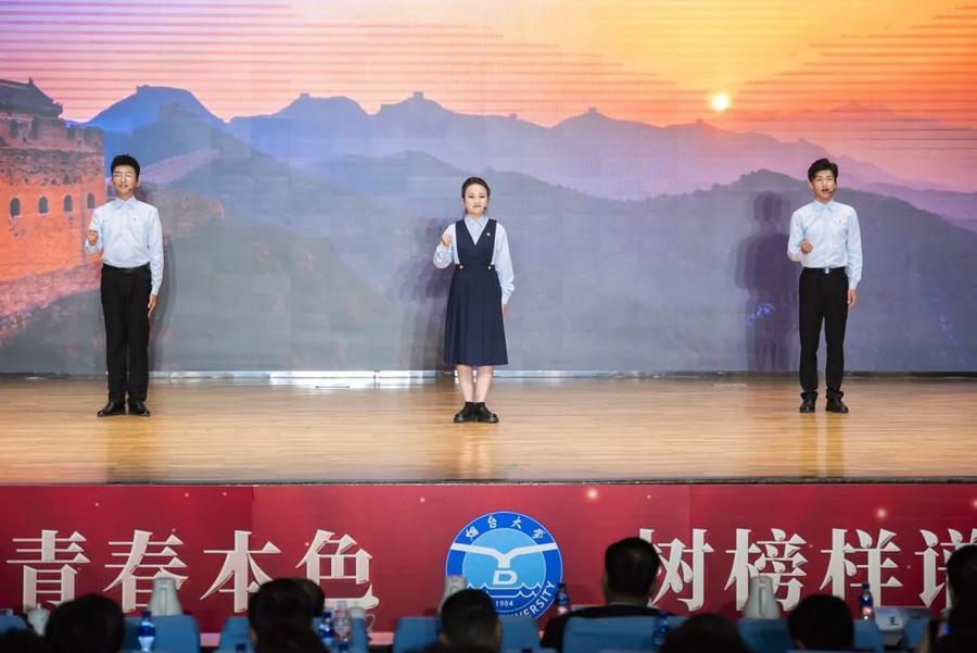颁奖典礼中还精心编排了其他兼具思政味、青年味的校园文艺作品,充分展现了烟大青年学子自信阳光的青春风貌。闪亮的团徽映衬着奋斗的青春,火红的团旗闪耀着坚实的足迹。讲述《青春飞young》中,青春榜样文学与新闻传播学院万锦涛、烟台大学“热血胶东•红色育人”大学生宣讲团代表刘振兴、第十八届“挑战杯”竞赛国赛特等奖——朝夕拾遗团队代表王晓迪、机电汽车工程学院辅导员牟城健用他们的故事让我们看到了“有理想、敢担当、能吃苦、肯奋斗”的青年模样。