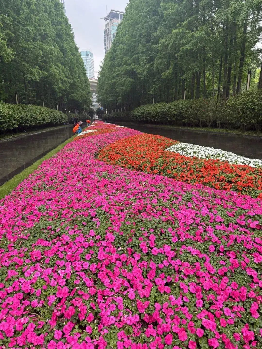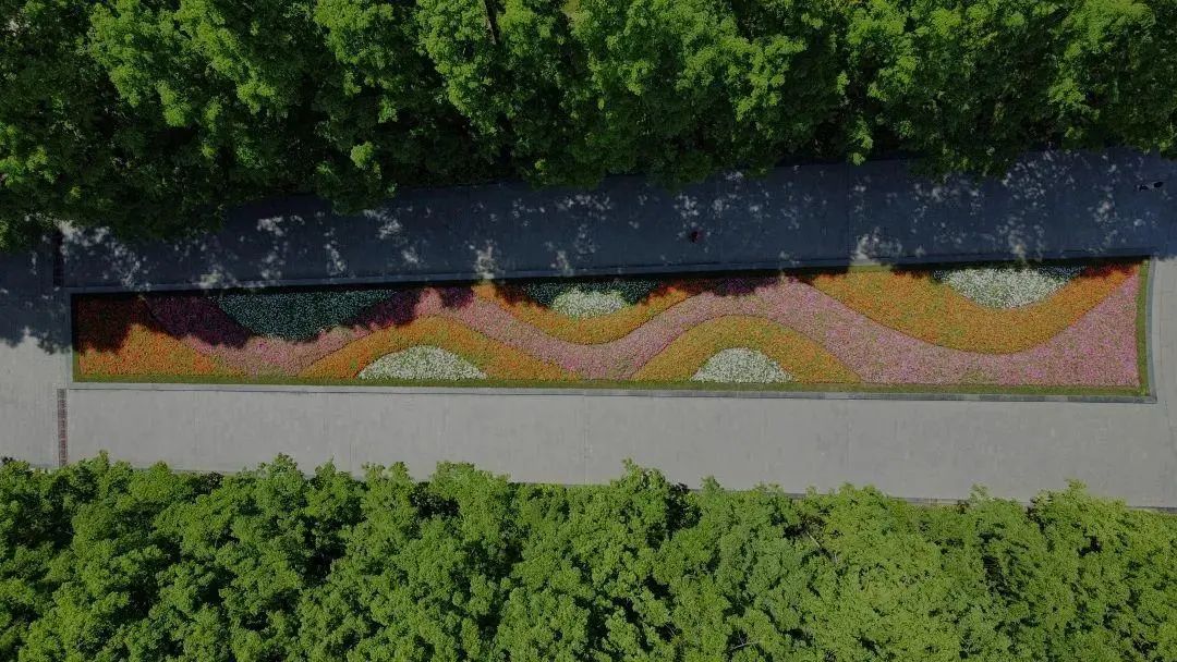 广场公园则以《光辉岁月》为主题,图案设计一改之前规则对称的形式,以不规则弧线形成的“飘带”作为主要构图元素,活泼灵动。飘逸的弧线像温暖的臂膀将延中绿地揽入怀中,夺目的红色更将节日的气氛妆点得格外喜庆、热闹。