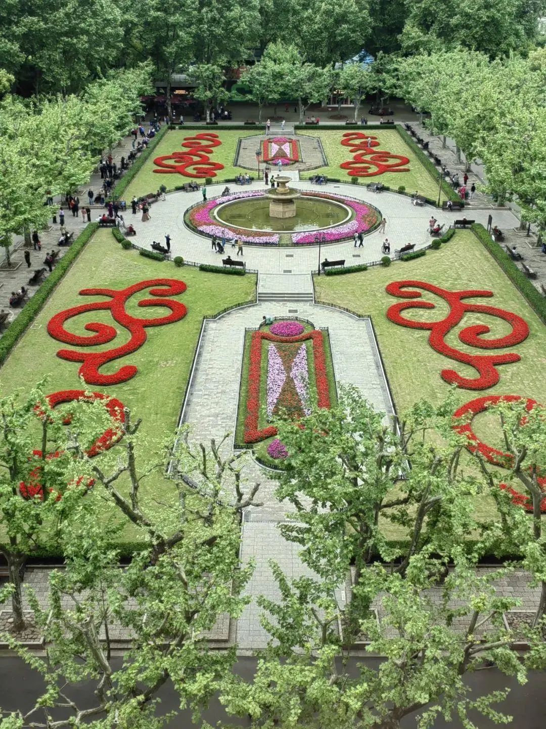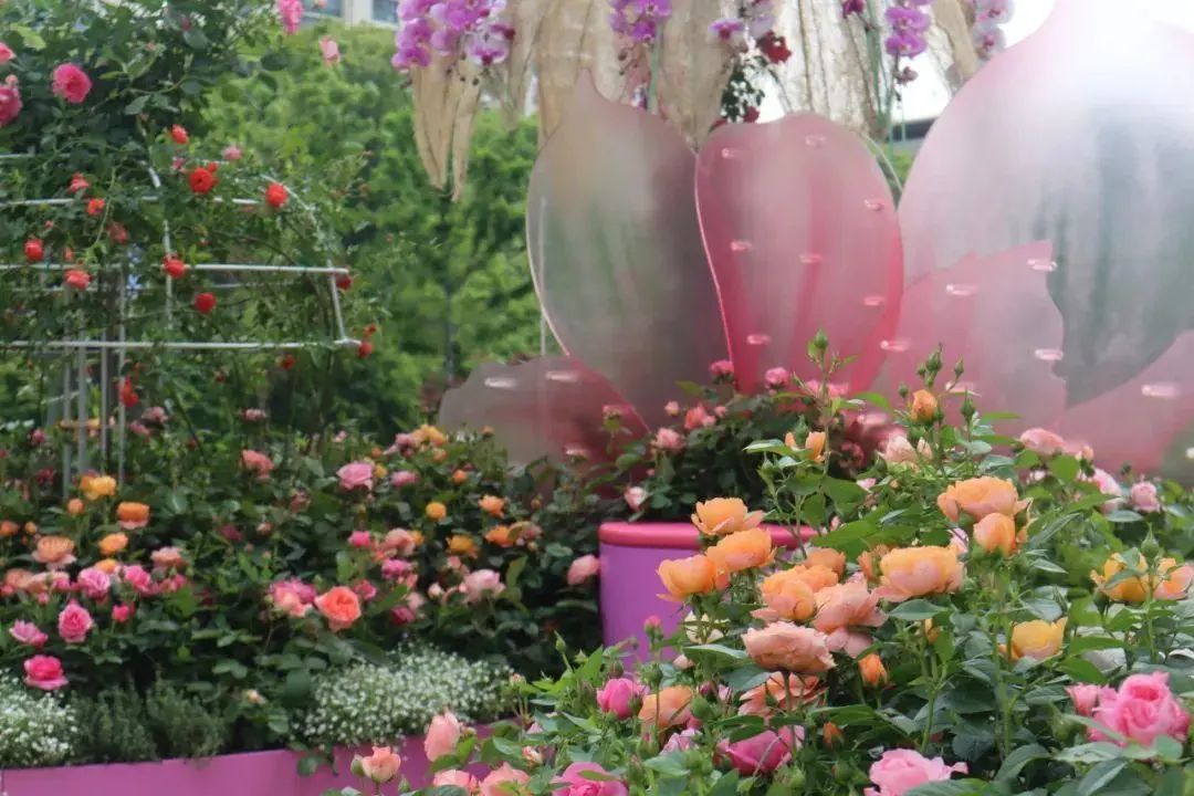 在黄浦大大小小的公园,花卉布置形式多样,花坛花境、主题景点等营造出浓浓的节日氛围。复兴公园《奔放的旋律》花坛布置运用红、淡粉、黄、橙等色系花卉,以暖色调为主,柔美统一,伴随着喷泉开启,朵朵“浪花”仿佛奔放的旋律“翻腾”起来,凸显这座百年公园开放、包容的魅力。