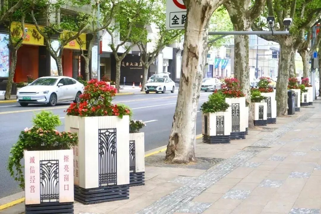 在绿地、街角,春季花卉的缤纷姿态更是展露无遗。淮海中路花箱由三角梅、西洋鹃、海棠、常春藤组成,景观错落有致,配色大方淡雅,呈现出缤纷靓丽、和谐自然的植物色彩。西藏路花箱由品种月季果汁阳台,黄金喷泉绣线菊,矾根,品种绣球,常春藤组成,各色时令花卉搭配相得益彰,景观效果亮丽别致。