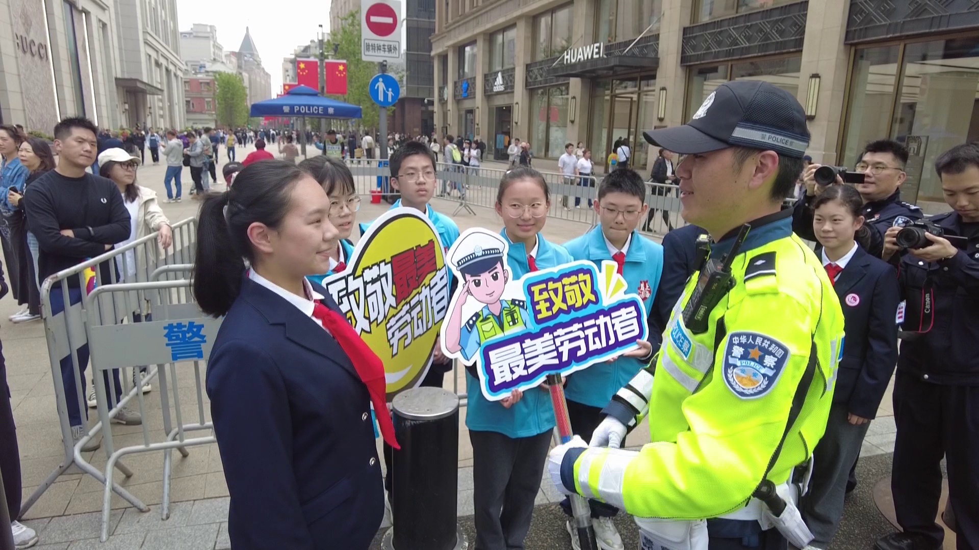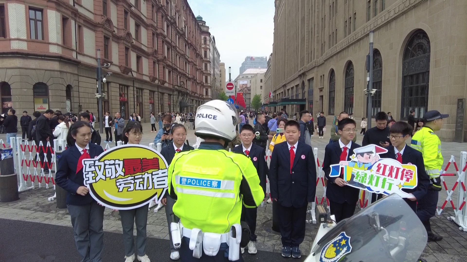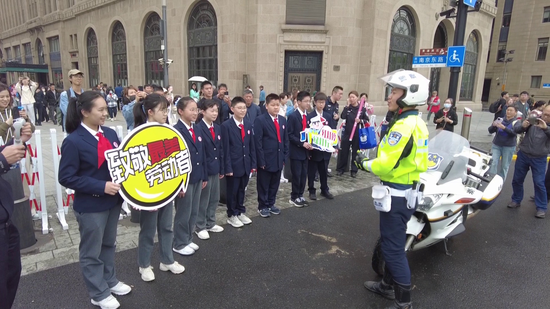 今天是五一国际劳动节,是全体劳动者的节日。上午9点,由黄浦交警支队与上海市市八初级中学携手开展的青少年“体验劳动美,致敬最美劳动者”主题活动在南京东路外滩中山东一路路口举办。同学们通过体验,感受节日交警坚守岗位的辛劳,为城市道路交通安全运转的付出,致敬最美劳动者。