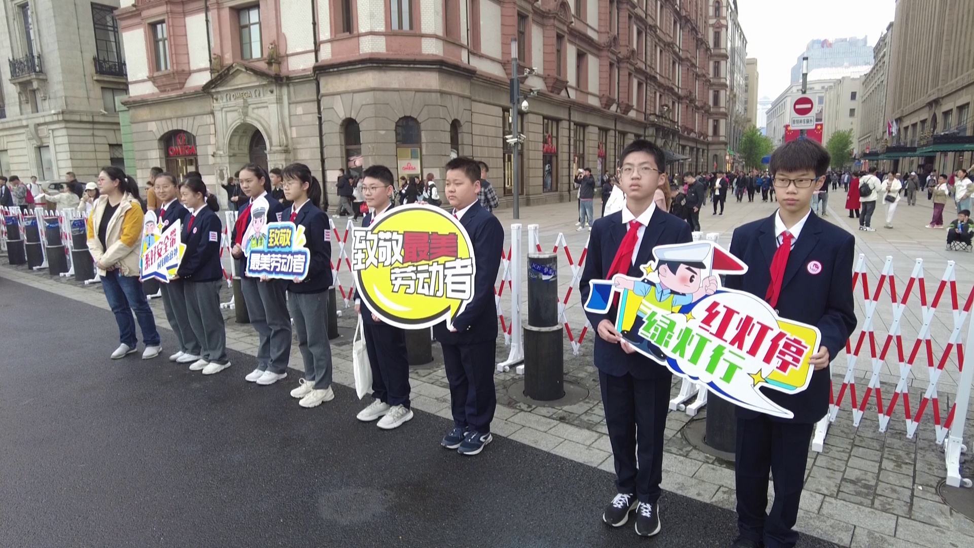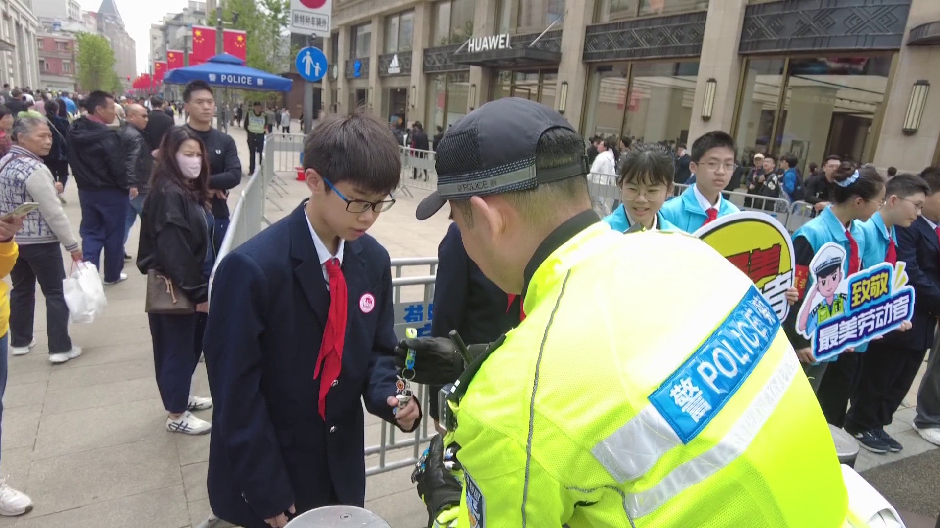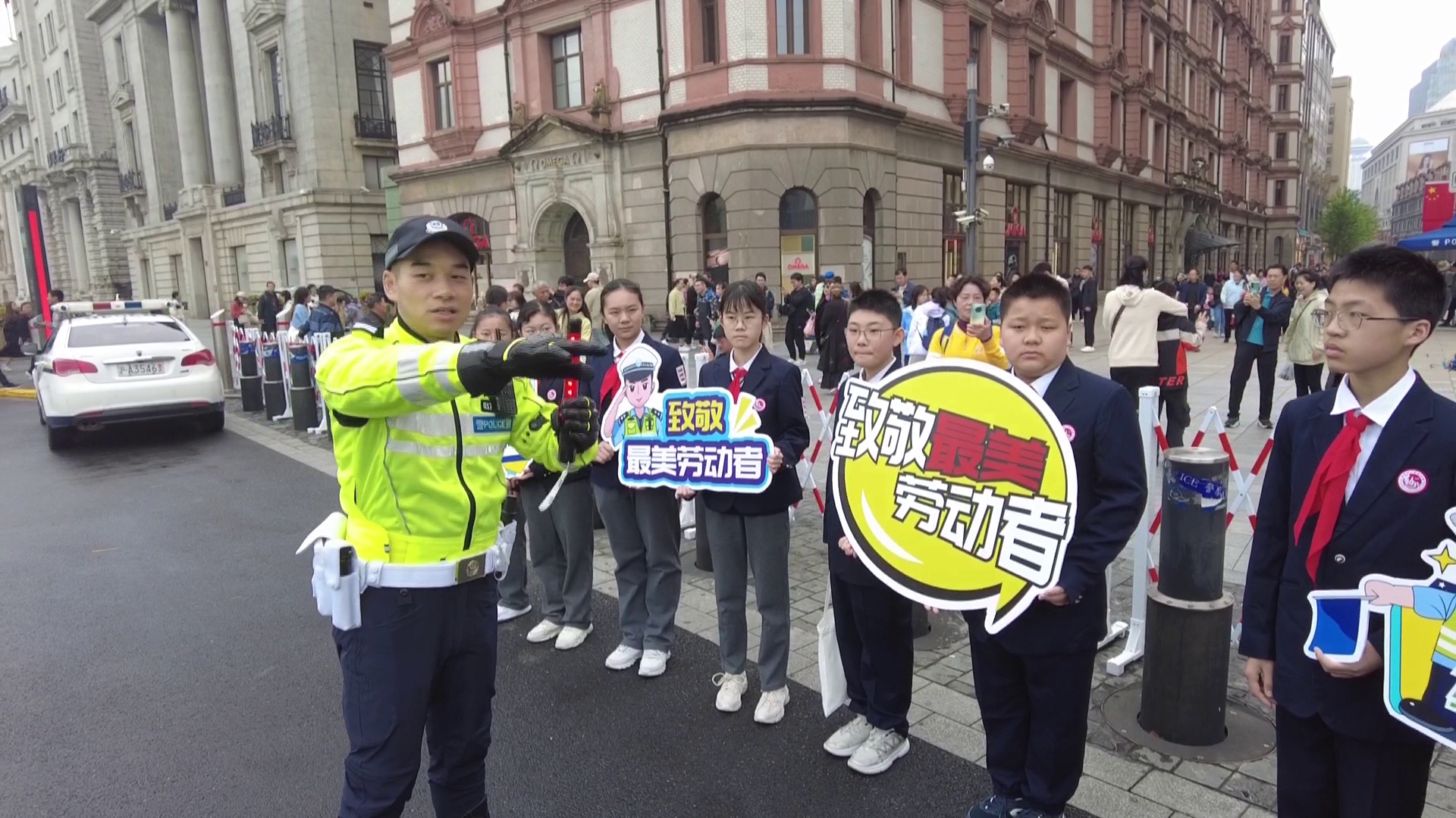 今天是五一国际劳动节,是全体劳动者的节日。上午9点,由黄浦交警支队与上海市市八初级中学携手开展的青少年“体验劳动美,致敬最美劳动者”主题活动在南京东路外滩中山东一路路口举办。同学们通过体验,感受节日交警坚守岗位的辛劳,为城市道路交通安全运转的付出,致敬最美劳动者。