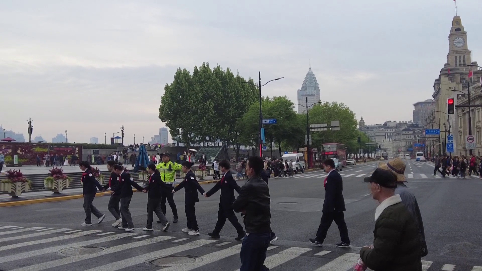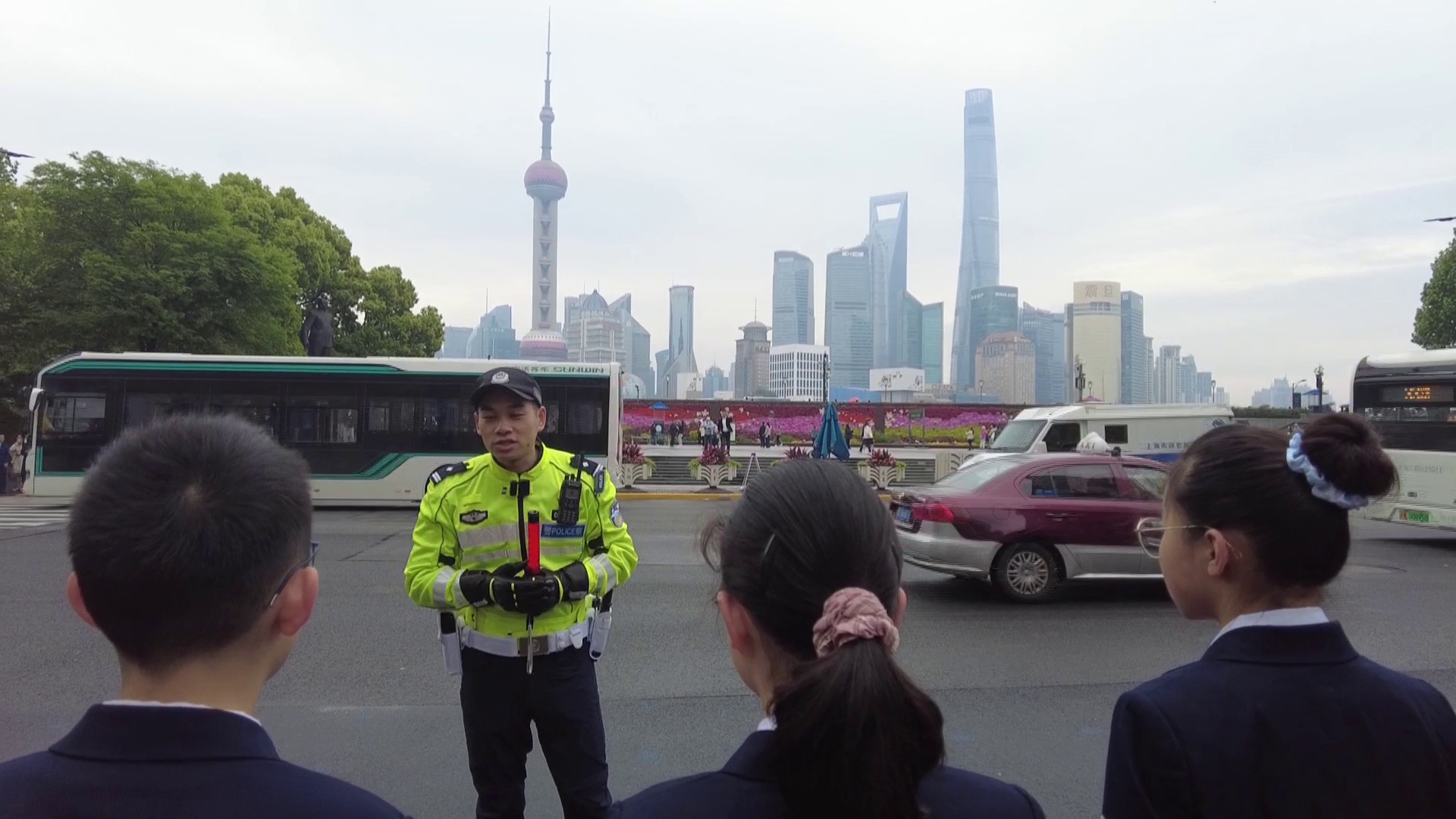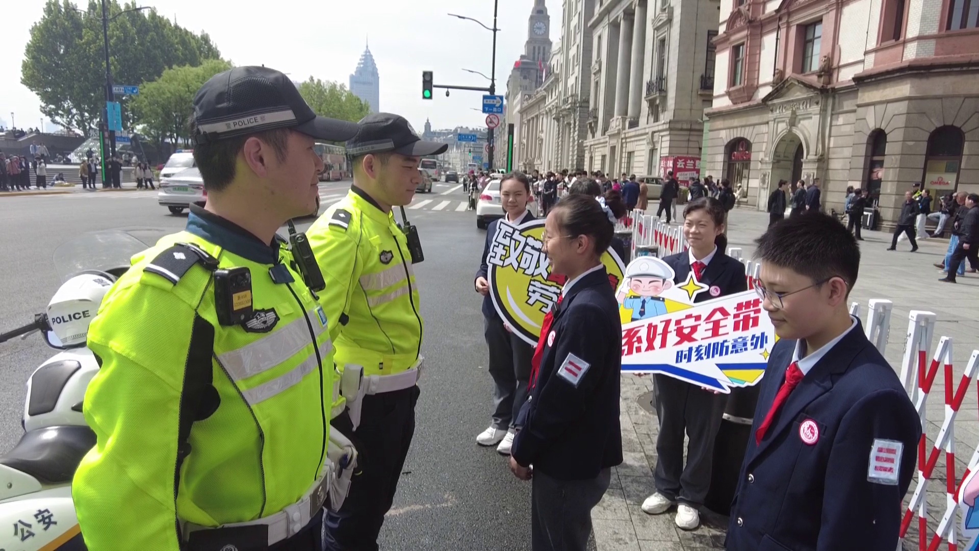 节日的外滩人头攒动,在南京东路中山东一路路口,同学们一眼就认出了正在认真指挥的正是外滩交警黄俊,他标准的动作和飒爽的英姿,赢得了学生们的敬佩和赞叹。在德育老师的邀请下,黄俊警官为学生介绍应对五一大客流“拉链式过马路”措施。黄俊通过现场互动,与同学们一起模拟如何手拉手形成“人墙”,演示怎么有效分隔行人和车辆,确保道路安全,同学们表示没想到民警默默付出这么多,感受到民警坚守岗位的辛劳。
