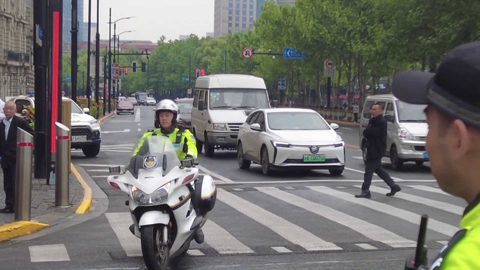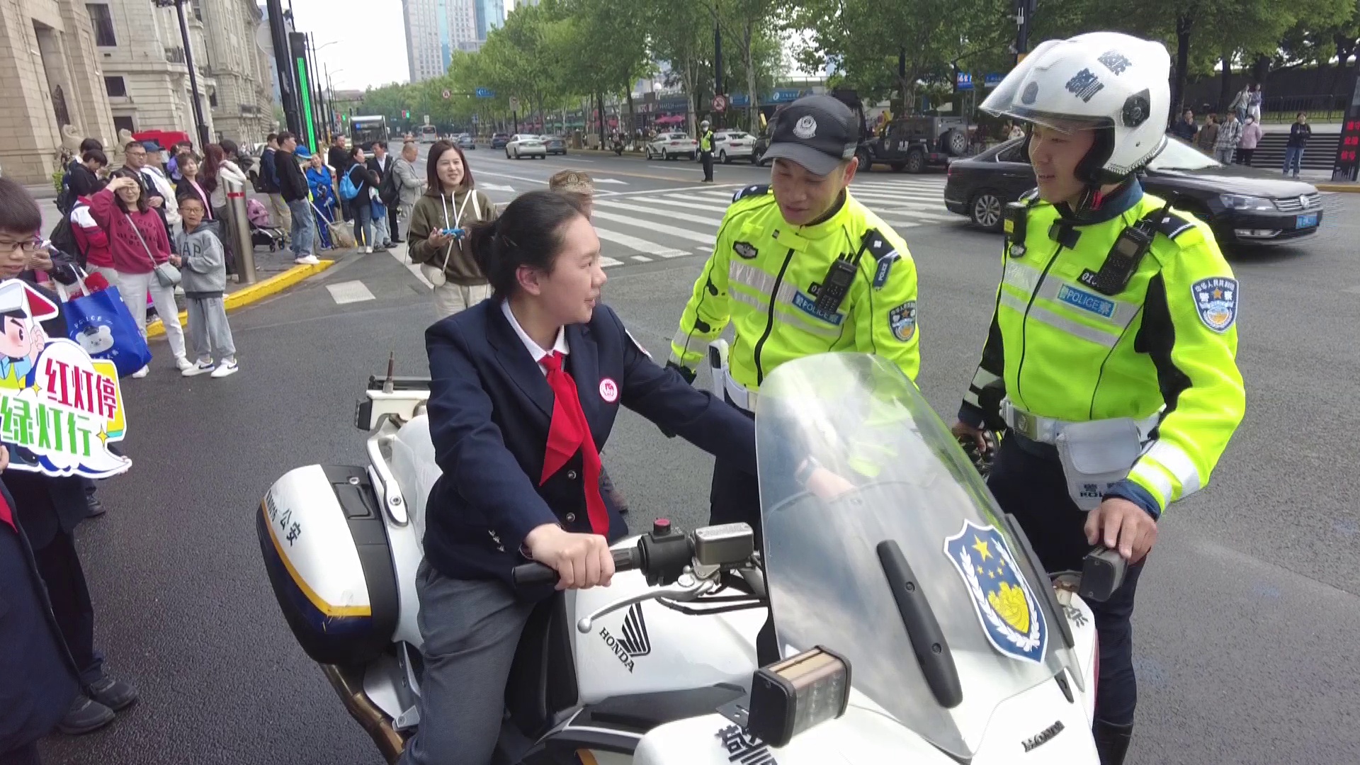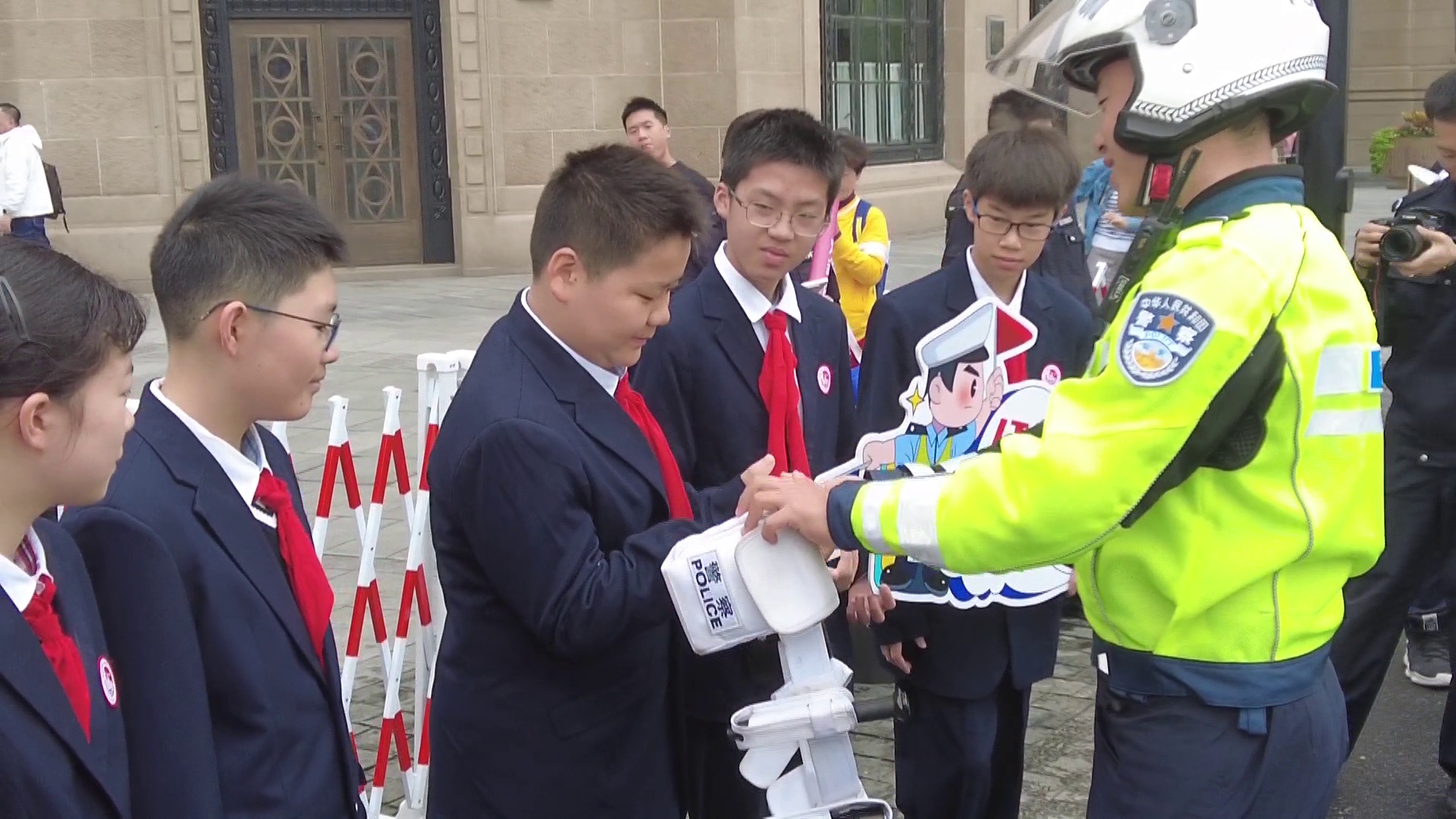 黄俊告诉同学,“我们民警会在人行道的两侧形成一道人墙,在人行道两边形成一道人墙。当红绿灯是绿色的时候,我们会在旁边护送引导行人在人行道上通过。当红灯的时候,万一人多,红灯,过马路的行人没有看见红灯怎么办?我们这个时候就要关了。怎么关?从中间向两侧打开,把没有过人行道的行人,再引导回人行道内,等待下一波的绿灯继续前行”。“要和行人说,要加快脚步过人行道。”