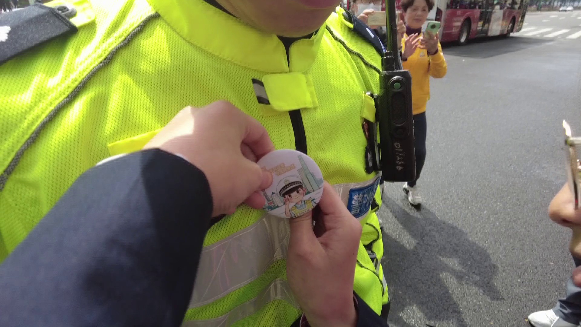 为了感谢五一最美劳动者的守护,同学们把自己亲手设计的交警小徽章,佩戴在了路口坚守岗位的交警胸前。黄俊警官也拿出了黄浦交警的纪念品赠送给同学们。学生表示,五一假期里,交警叔叔放弃休息时间,坚守岗位一线,有条不紊地指挥路况,守护大家的出行安全,要向他们致敬。“非常尊敬他们,对他们产生了一种敬佩的心理。”老师们表示,“我们看到交警飒爽的英姿和标准的手势,指挥着交通,守护着我们城市的安全,他们是城市亮丽的名片,也是我们身边最可爱的人”。