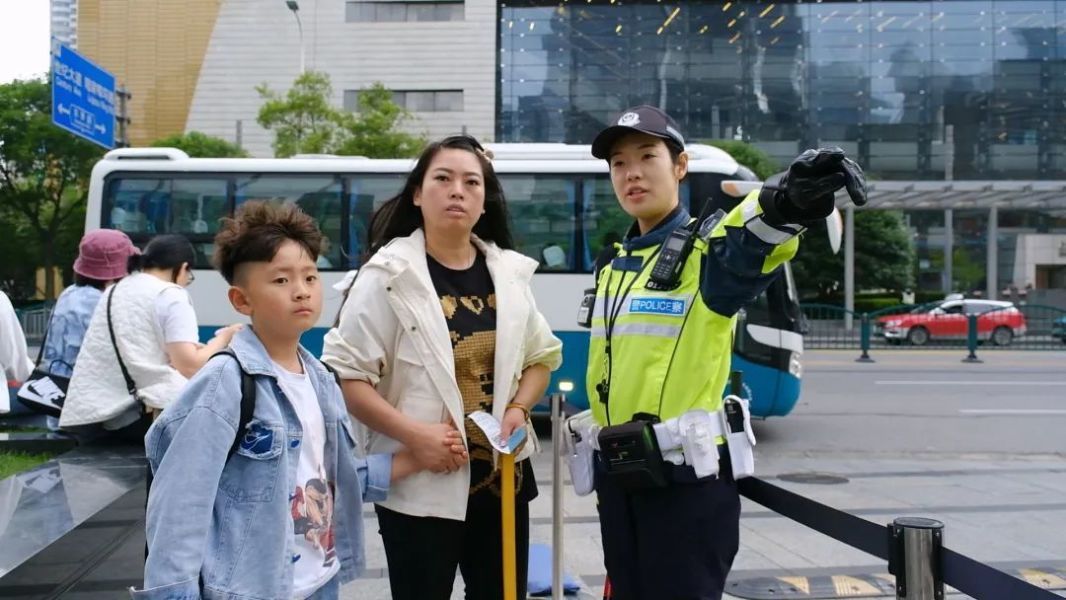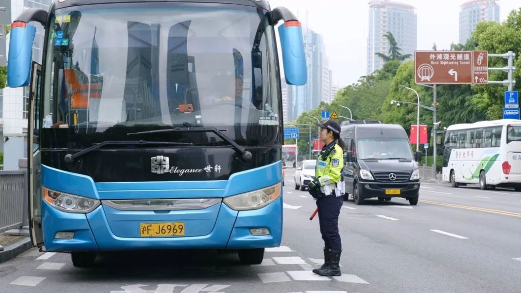 除了散客外,许多外地来沪的旅游大巴也会停在此地。为了便于游客朋友在“网红景点”打卡留念,同时排除该路段的局部堵点,女警们早有准备,随时引导大巴驾驶员即停即走,在下客后开往东泰路另一路段的大巴专用停车场,加大了花园石桥路的通行效率。